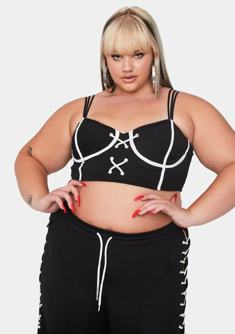 cuz you run this ish like cardio! Show âem ur the #1 playa in the game with this sporty & spicy set that includes a bustier crop top with contrast piping & a lace up front and a pair of wide leg, high waist track pants with lace up sides & a drawstring waistband.