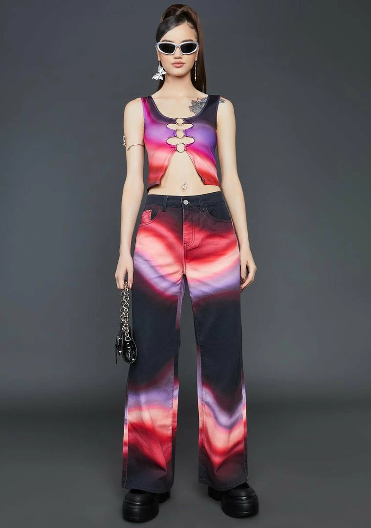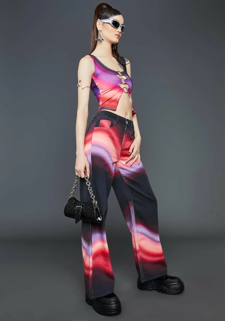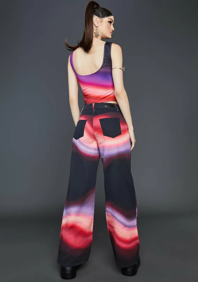 cuz all is fair in love and war. These denim jeans have a high waist fit, a five pocket design, a gradient stripe print, and a wide leg silhouette.