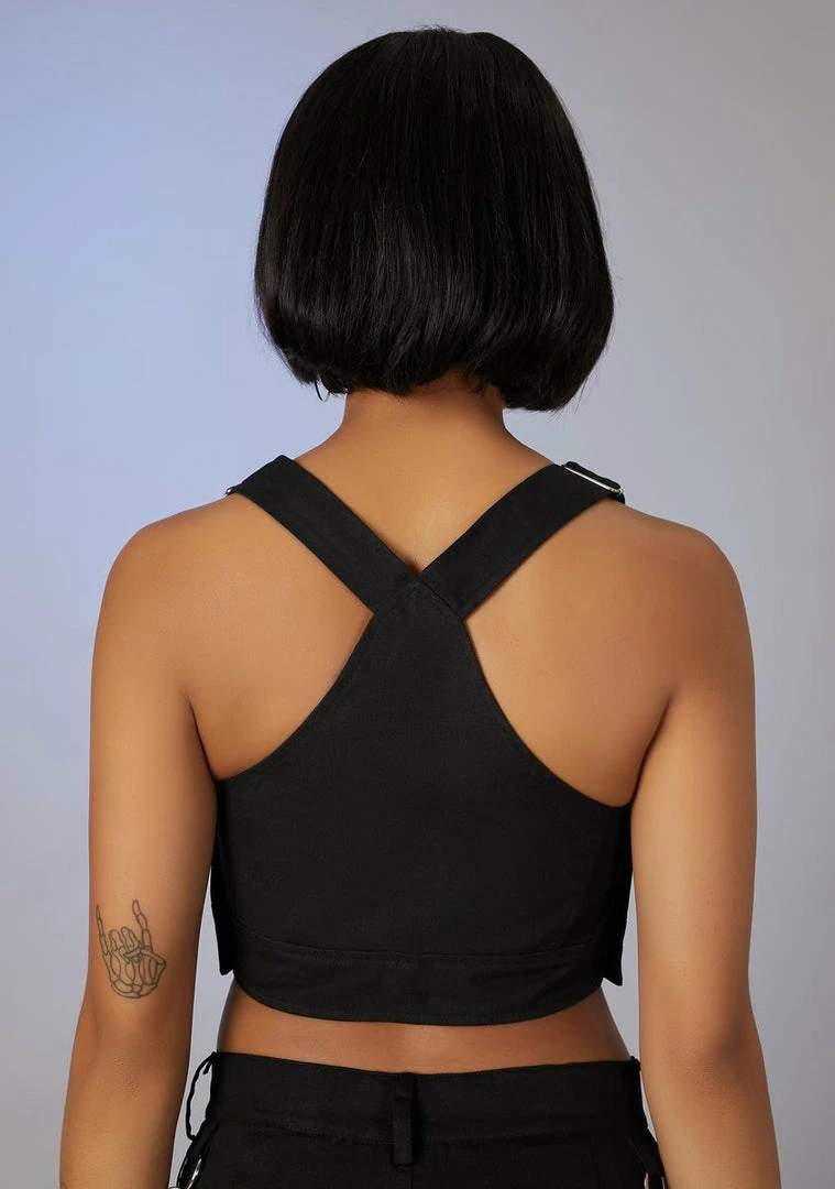 cuz youâve never backed down from a fight. This baddie tactical crop top has adjustable overall straps, utility pockets all over, and a fitted silhouette.