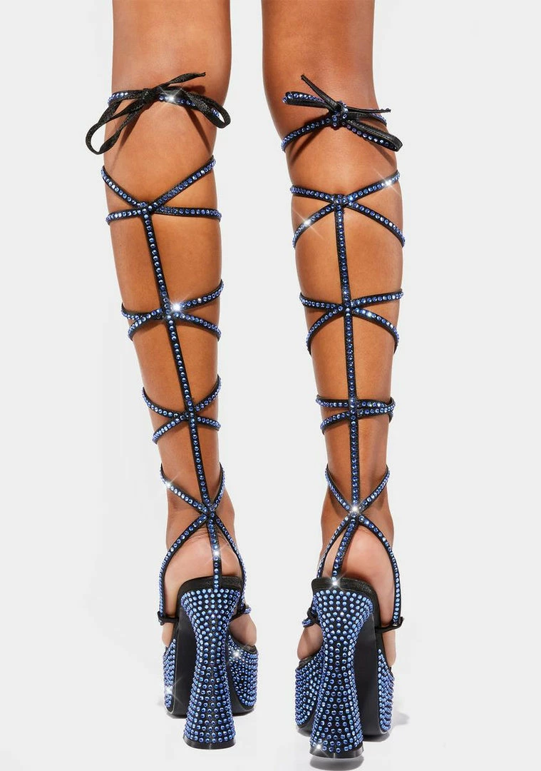 you’re giving us something to sing about. Dance for me in these lace up knee high heels with a platform sole and rhinestones all over.