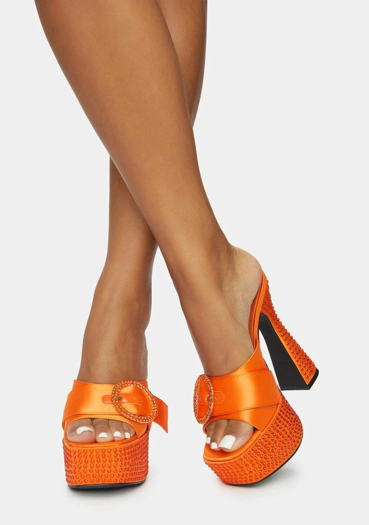 cuz youâre always in the lead. These platform heels have rhinestones all over, an open toe design, and thick upper straps with circular buckle details.