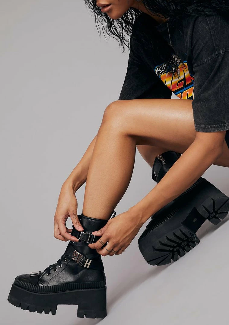this year is all about self-reflection. You’re keeping it real in these combat boots that have a vegan leather construction, lace up fronts, side zipper closures, wraparound buckle straps, “Bad Bitch” letter charms, and treaded platform soles.