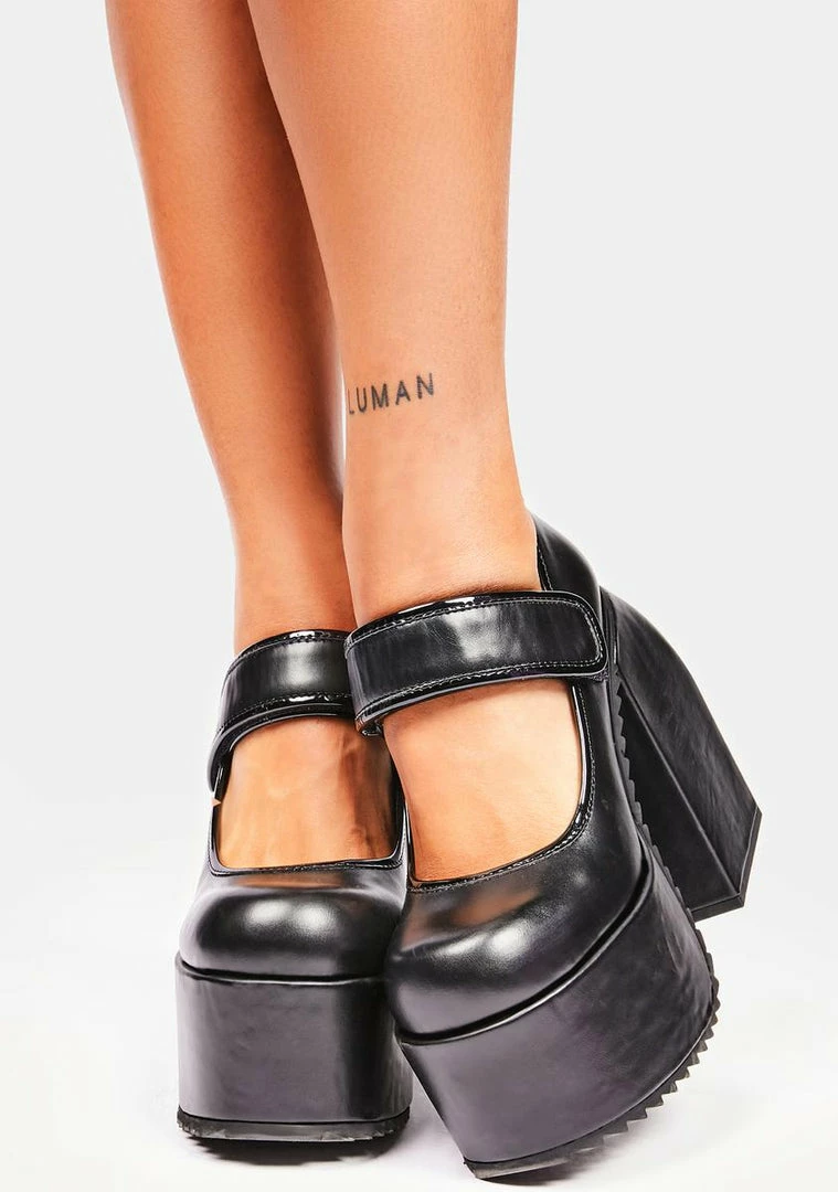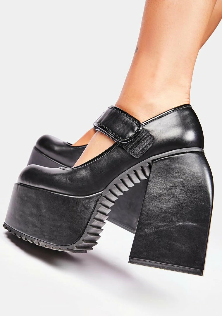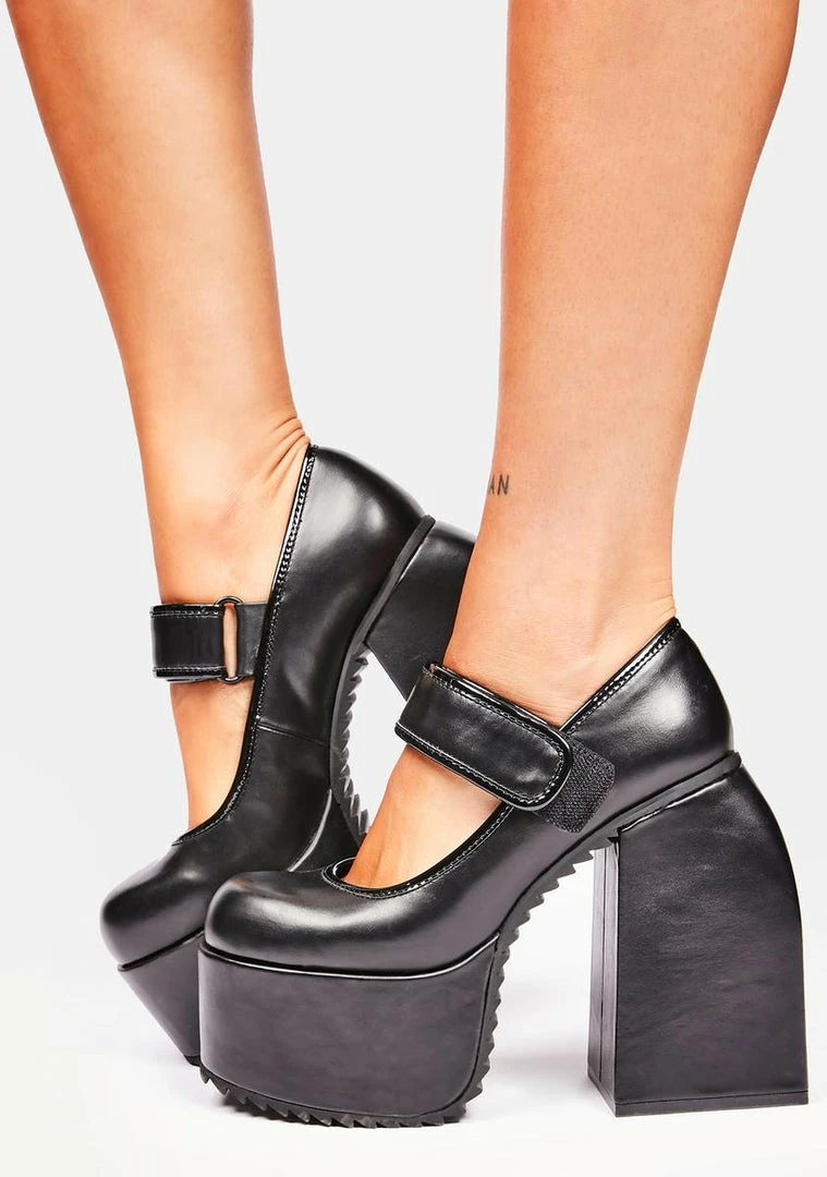 keep it sassy but classy, babe! These sporty platform mary janes have a vegan leather construction, thick block heels, rubber treaded soles, and adjustable velcro strap closures.