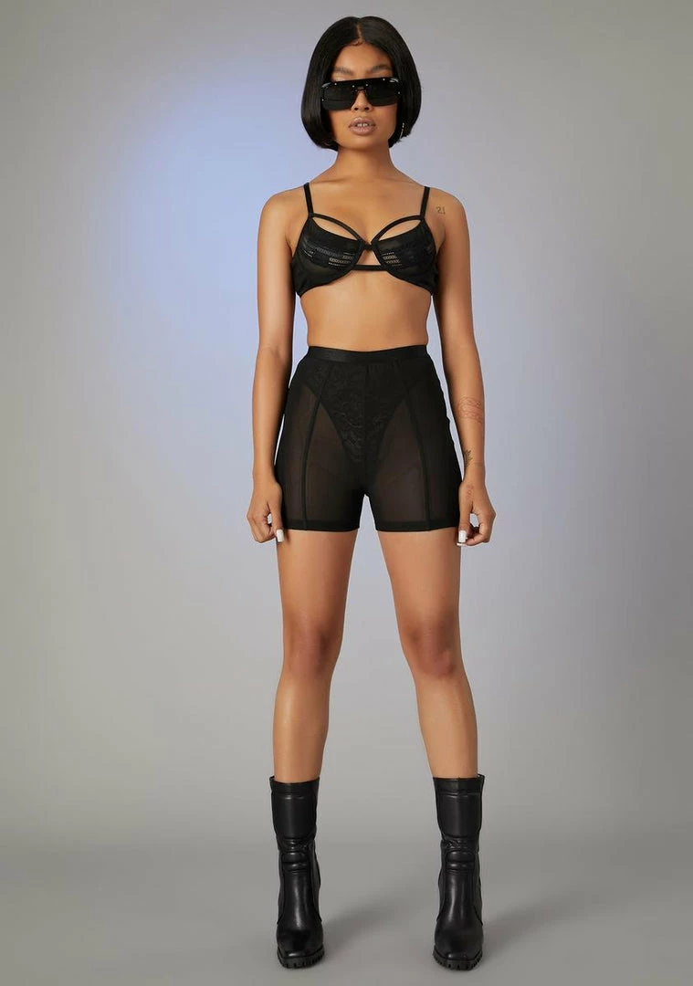 cuz you always put the werk in. This sheer mesh set includes a strappy bra with adjustable straps and back hook & eye closures and a pair of high waisted biker shorts with a built-in thong.