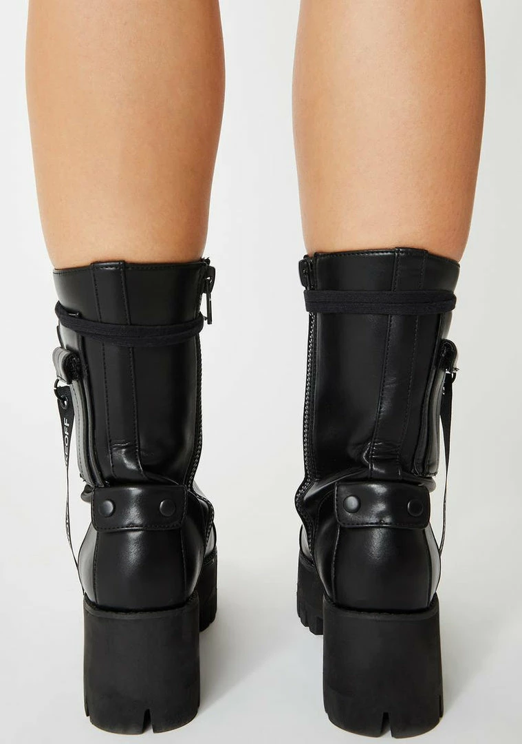 itz you versus the world, babe. Tell âem to measure up in these platform flight boots that have a sikk combat construction, rounded toes, front lace up Nâ side zip closures, detachable ribbon straps, and side pocket designs to hide yer stash.