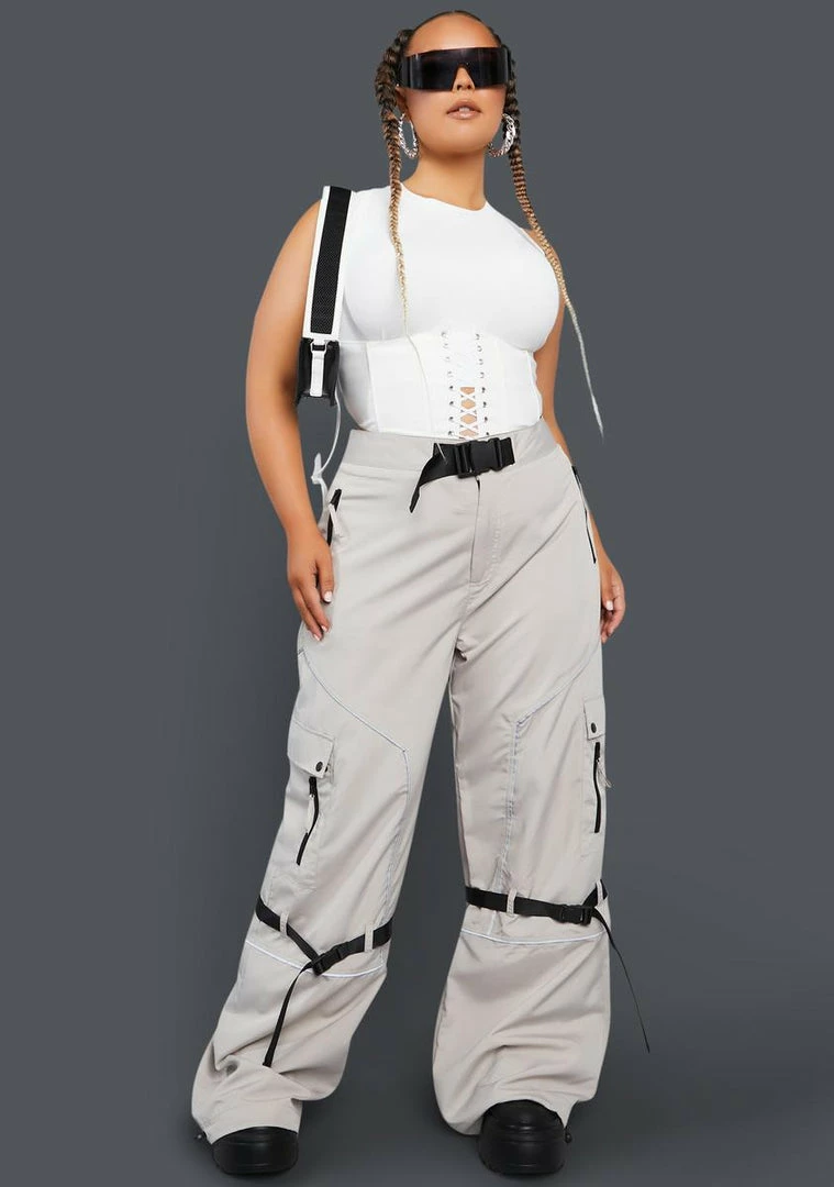 cuz you’re full of surprises. These cargo pants have a high-rise waist with a buckle belt, reflective piping trim, cargo pockets with snap button closures, nylon strap accents, and drawstring cords at the cuffs for an adjustable fit.