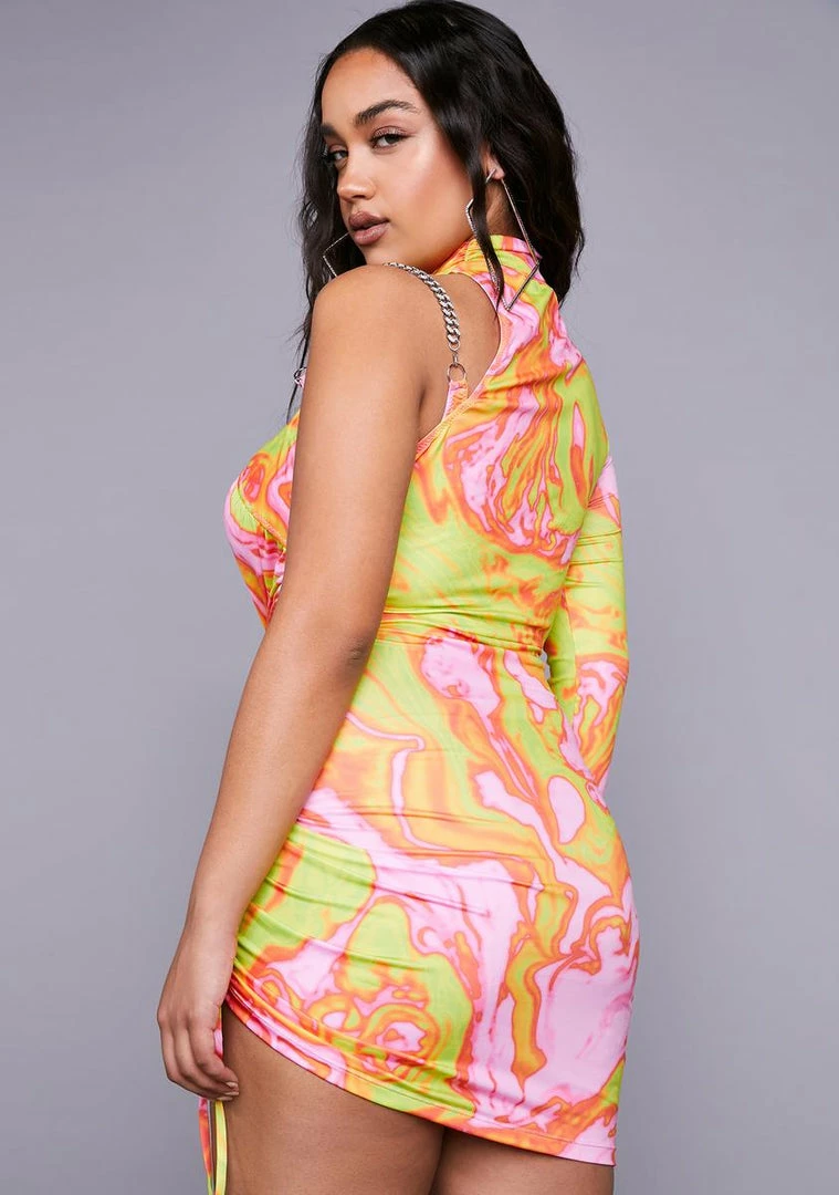 let’s bring it back to the future. This mini dress comes with a removable rhinestone cuban link shoulder chain, a ruched side detail with a tie closure, one long sleeve with a thumb cut out, a chest cut out, mock neck, and swirl print all over.