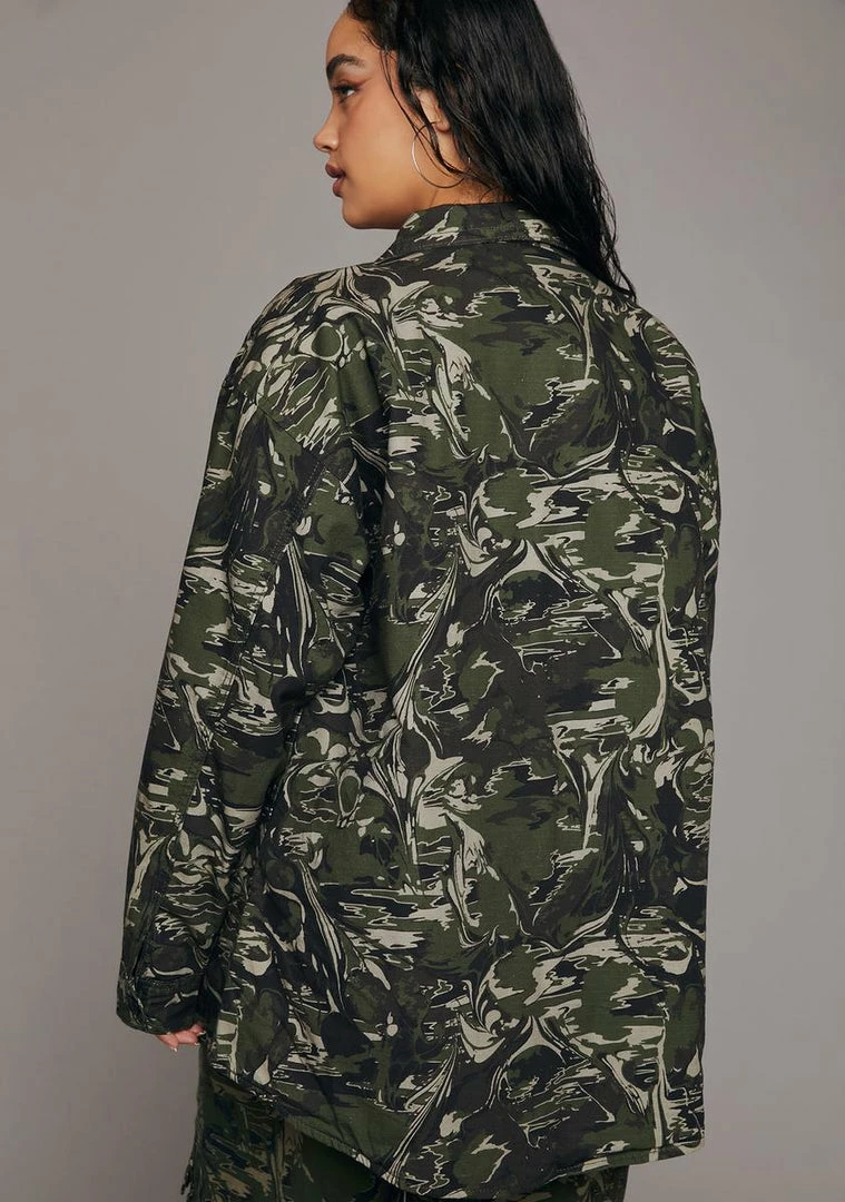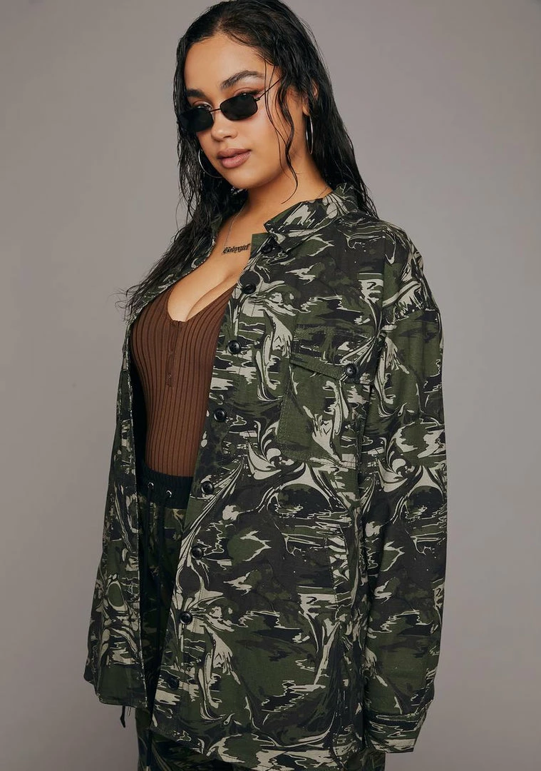 you gotta know who you’re dealing with. This jacket has an all over camo print, two breast pockets, contrast stitching, and button down front closures.