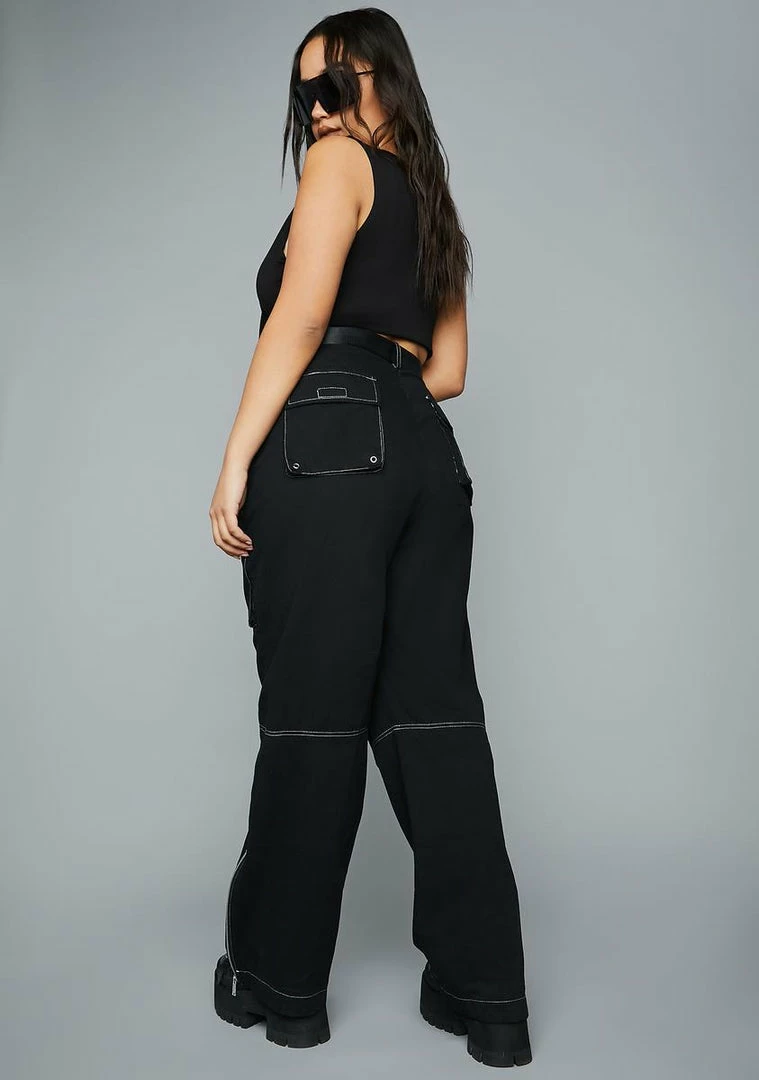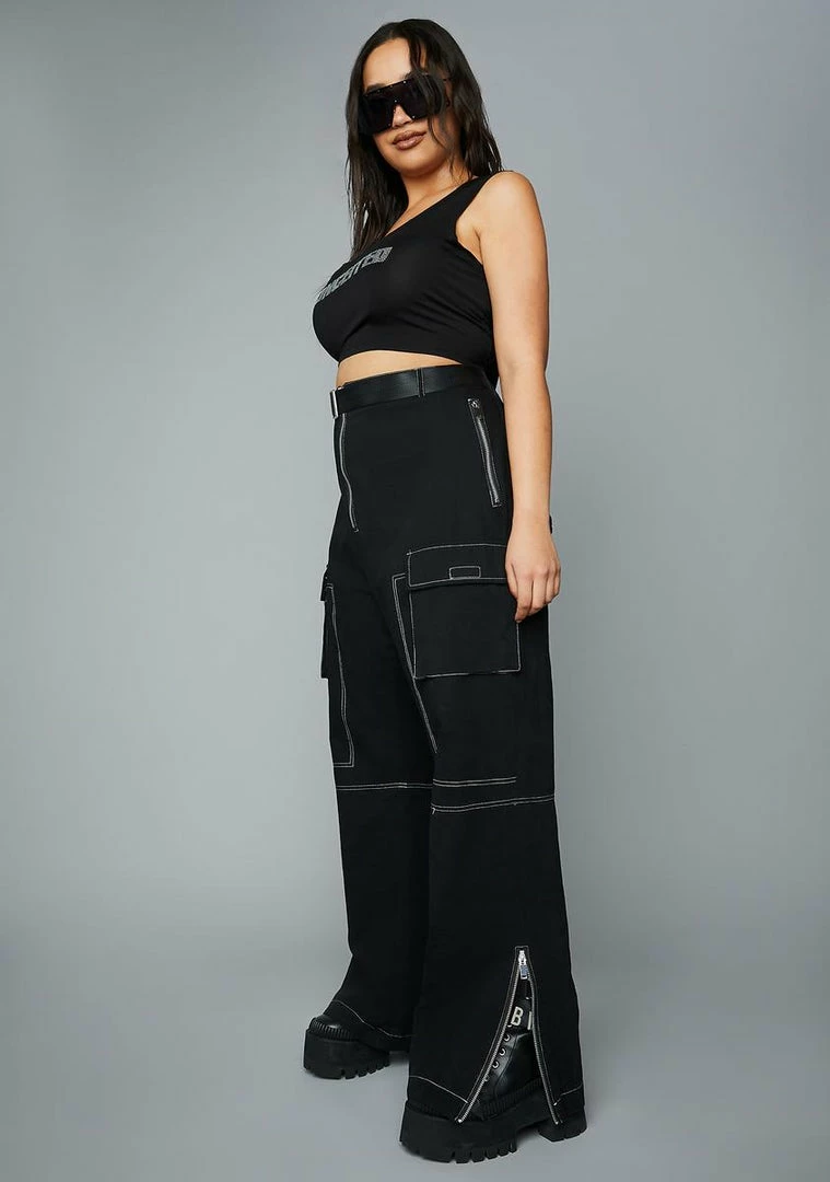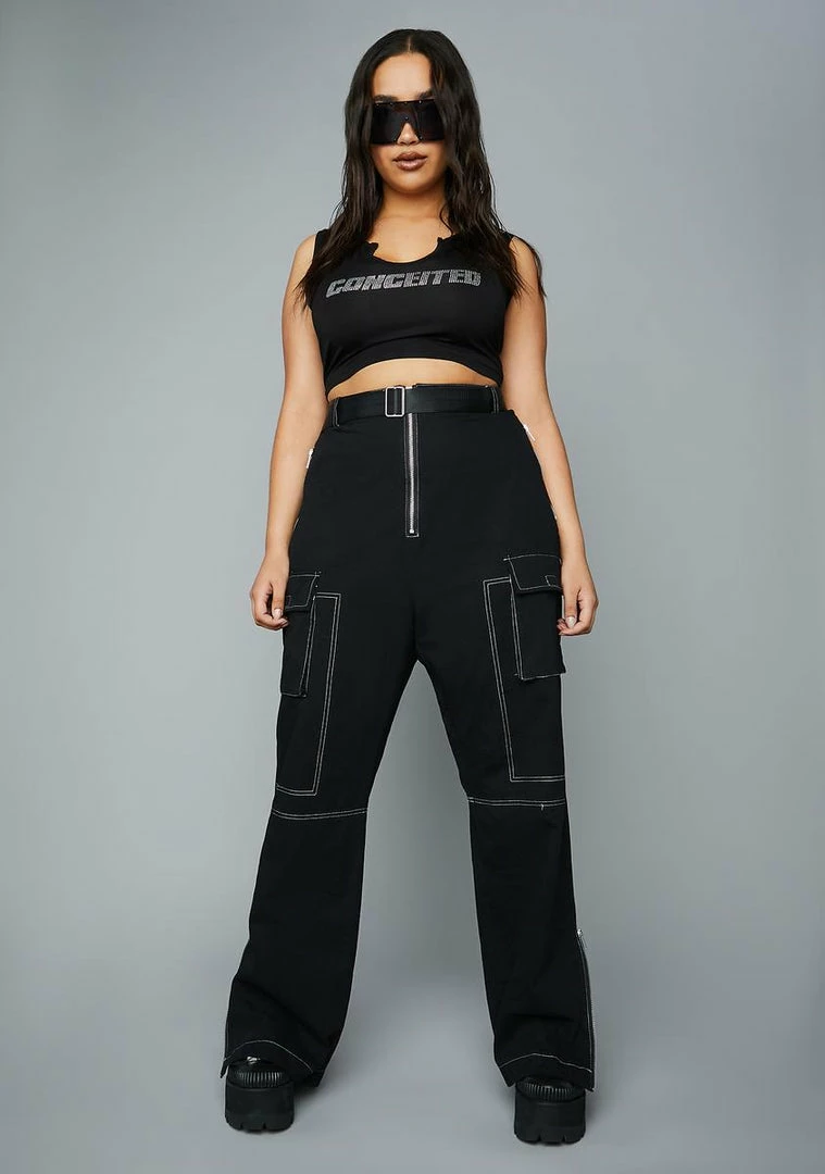 cuz I wish I could get away with it all. These cargos come with a front zip closure, zip pockets, velcro cargo pockets, a belt, and zip slits at the hem.