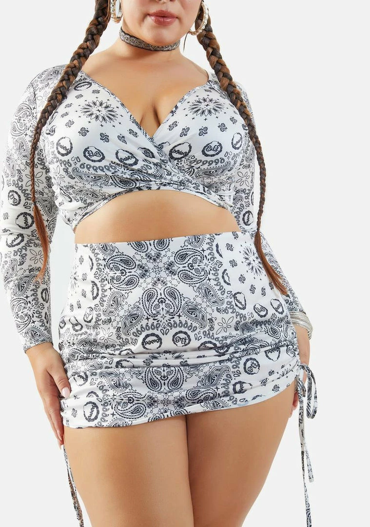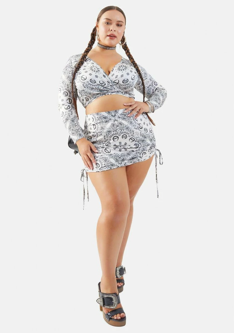 cuz anything goes in the wild wild west. Ride out in this high waist mini skirt with ruched cinch tie sides and an all over bandana print.