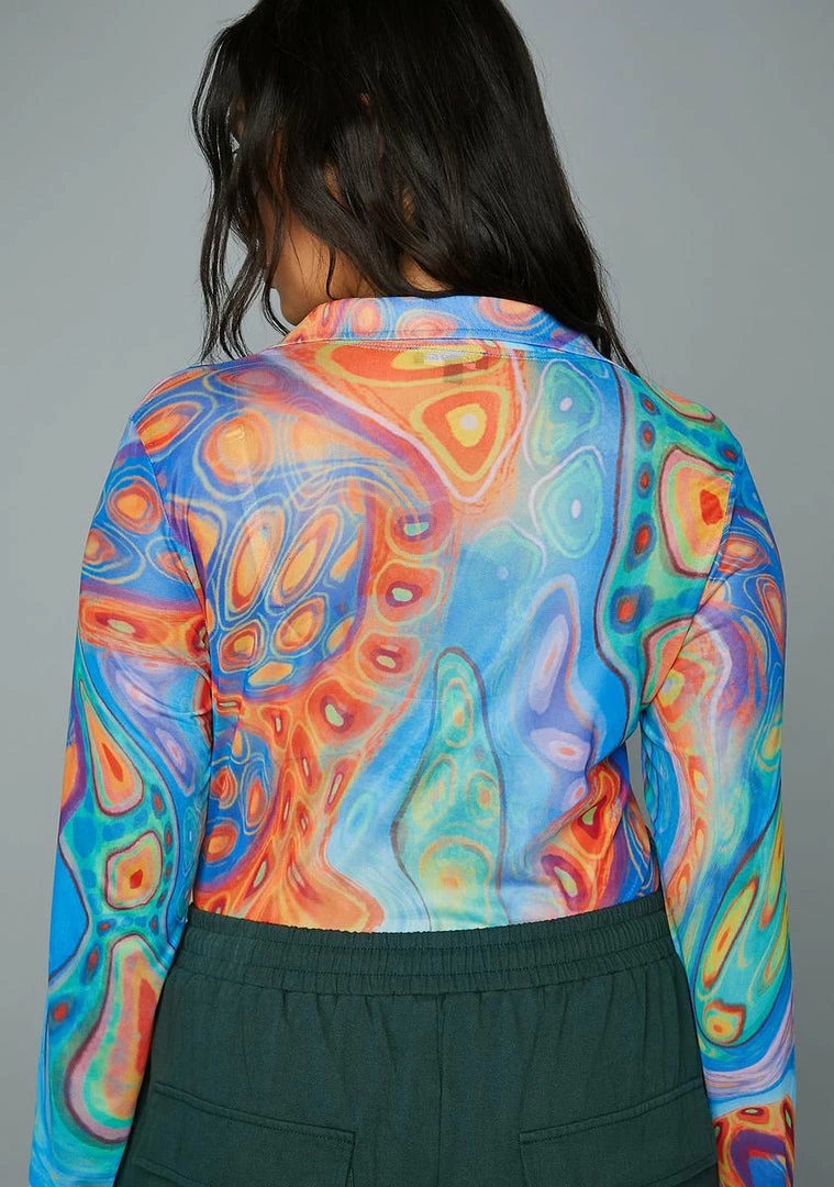 cuz you’ve got hypnotic habits! This long sleeve button up shirt has a mesh construction with a colorful trippy print all over, a cropped fit, and a collar detail with a V-neckline.