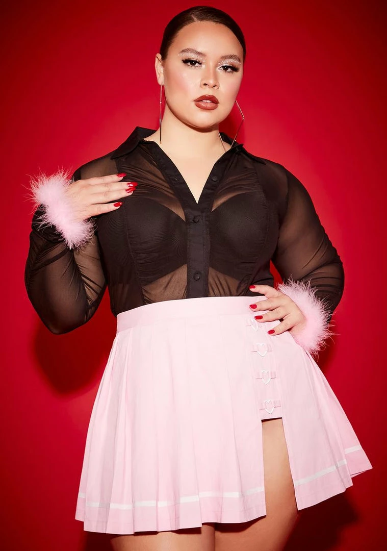 cuz ur playing a dangerous game, babe! This long sleeve mesh top features a collared neckline, button front closure, and contrast marabou trim at the cuffs.