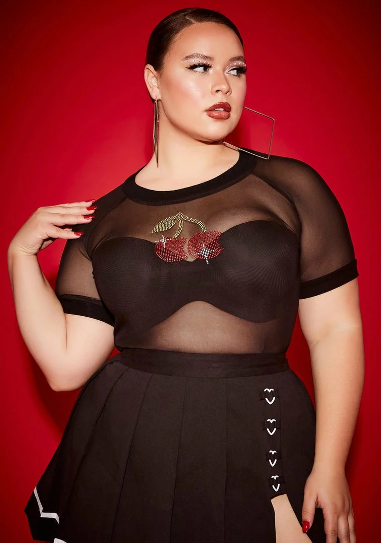 cuz youâve just got it like that! This mesh top features a cherry rhinestone graphic on the front.