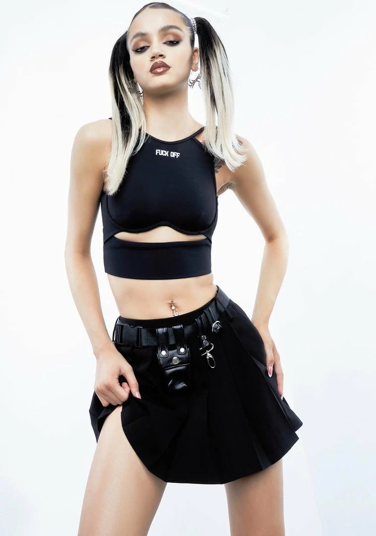 you canât help your baddie behavior! This pleated mini skirt has a high waist fit and a detachable utility belt with clip hardware and a pouch pocket.