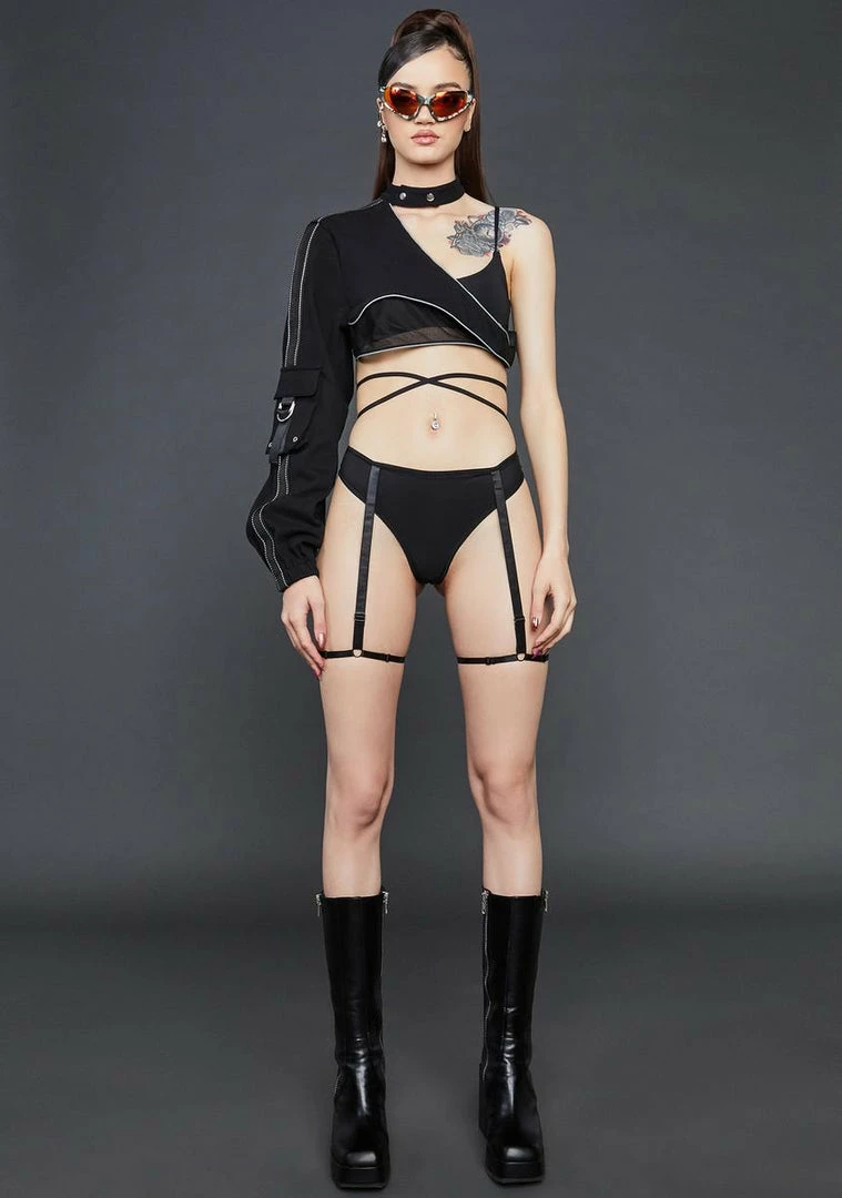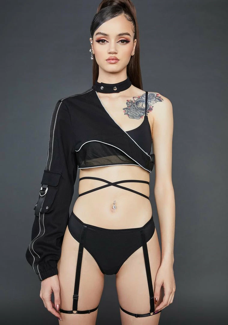 cuz you’re full of surprises. This crop jacket has a one sleeve design, an attached choker with snap button closures, reflective piping details, mesh trim along the front hem, a cargo pocket with D-ring hardware, and nylon trim down the sleeve.