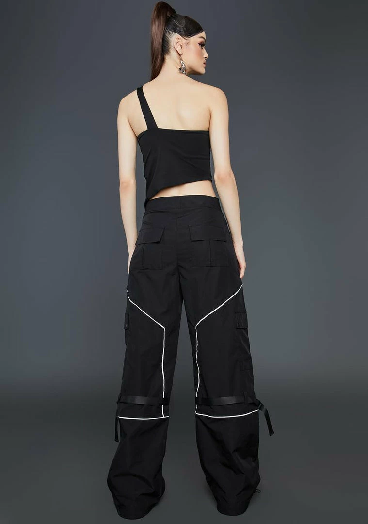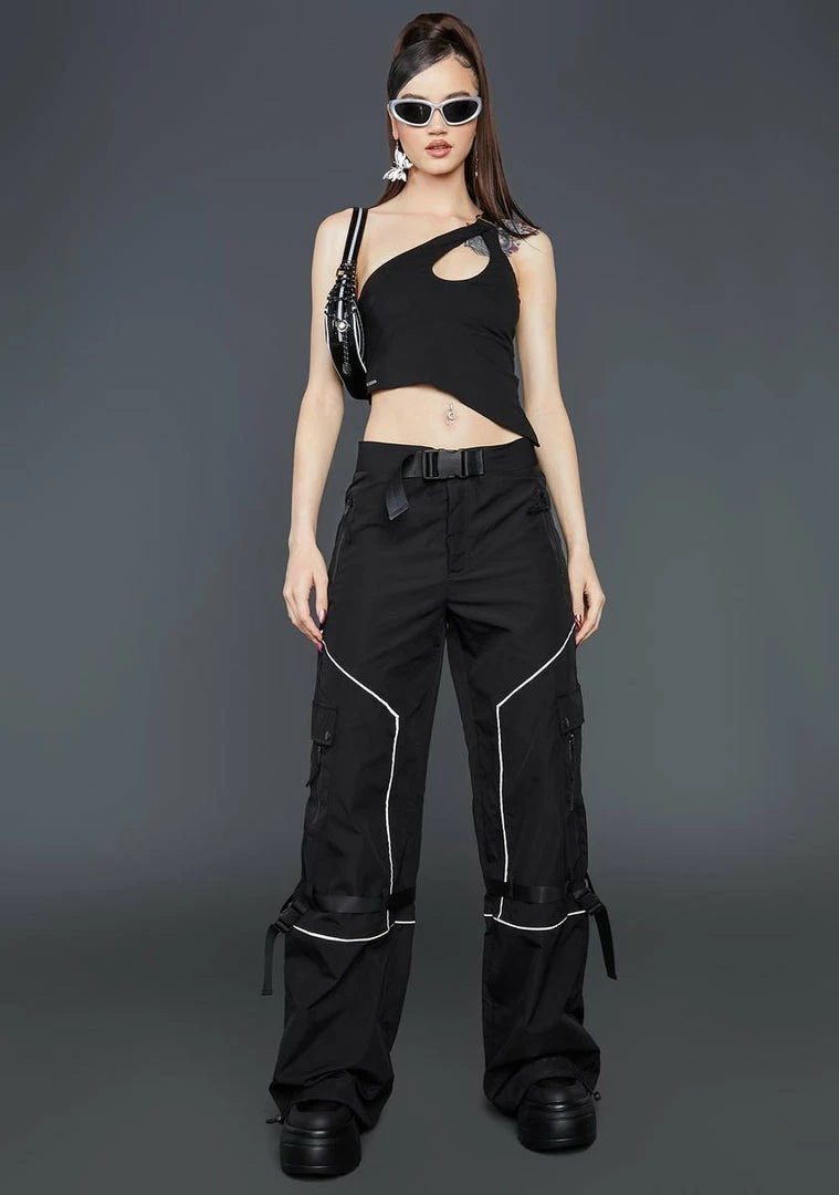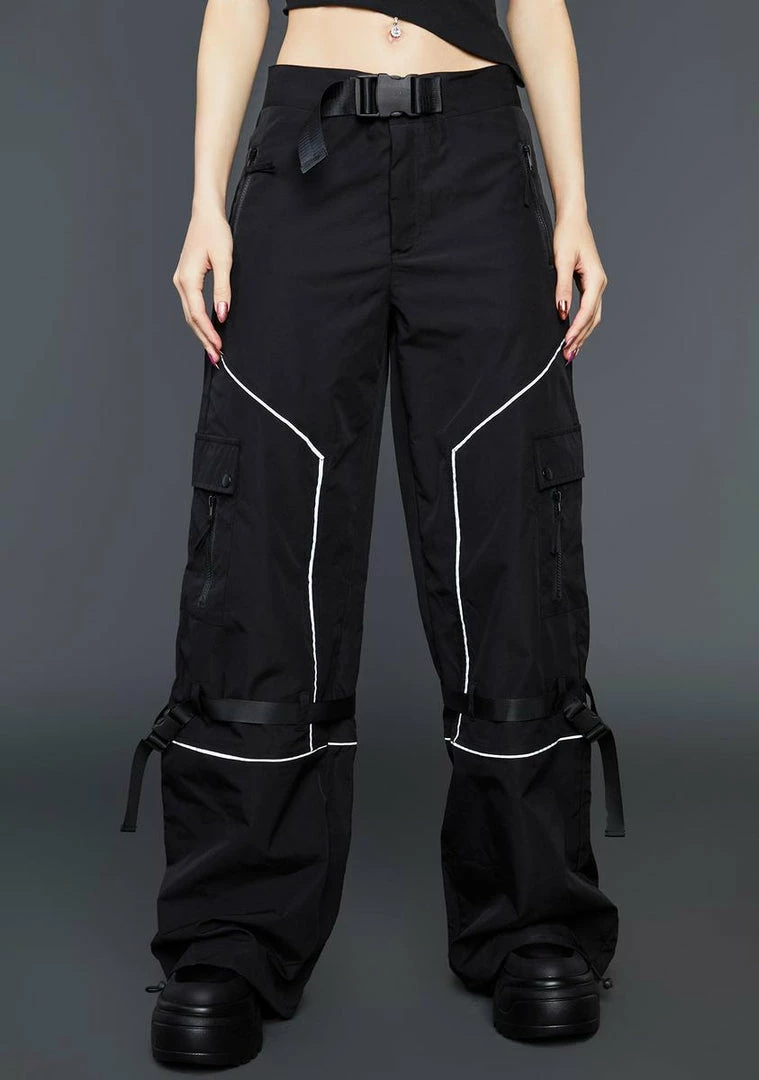 cuz you’re full of surprises. These cargo pants have a high-rise waist with a buckle belt, reflective piping trim, cargo pockets with snap button closures, nylon strap accents, and drawstring cords at the cuffs for an adjustable fit.