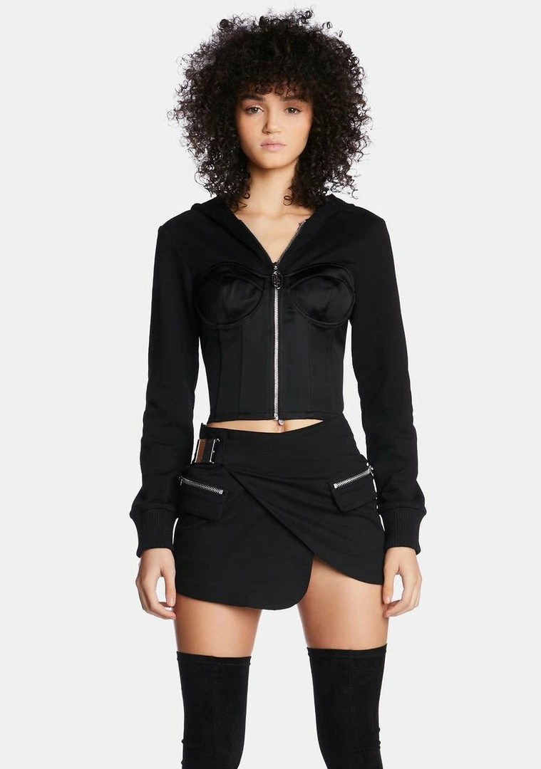 there is no comparison. This cropped hoodie has a satin corset bodice with structured boning, underwire bust cups, a fixed hood, a branded front zip closure, and long sleeves with ribbed cuffs.