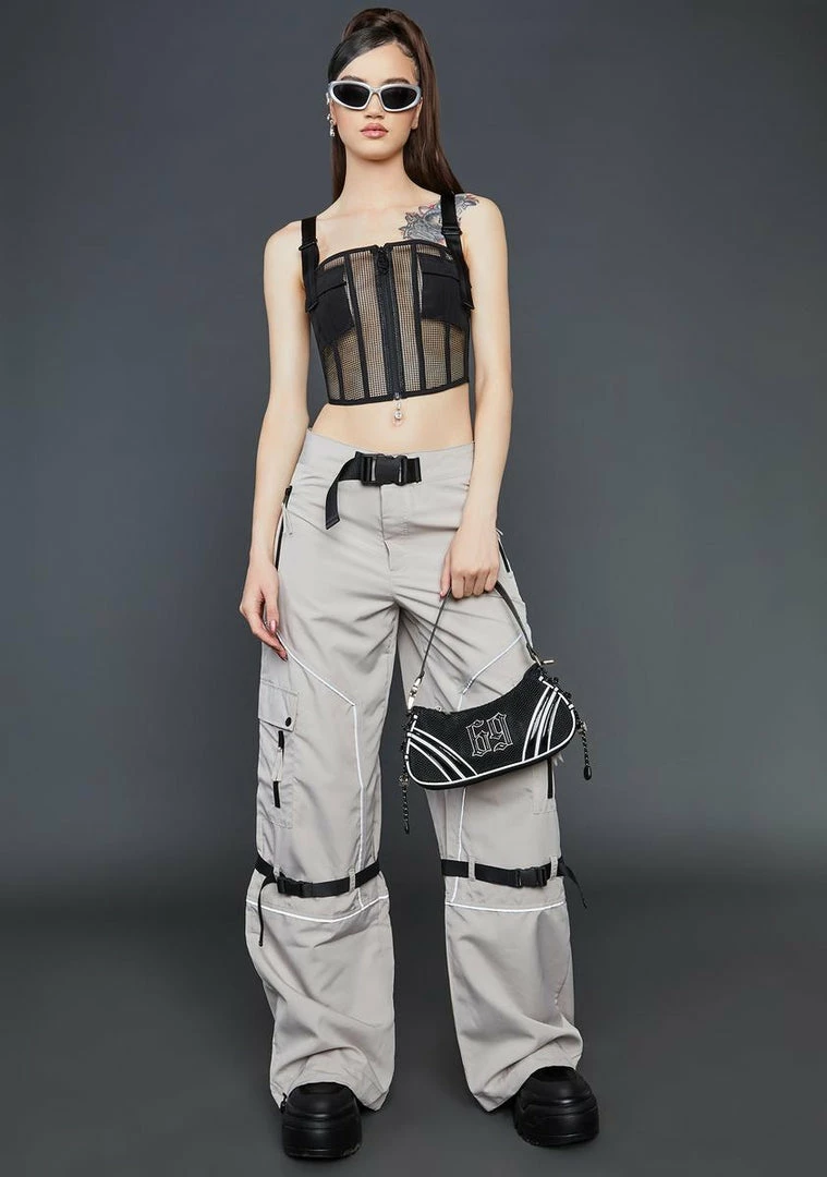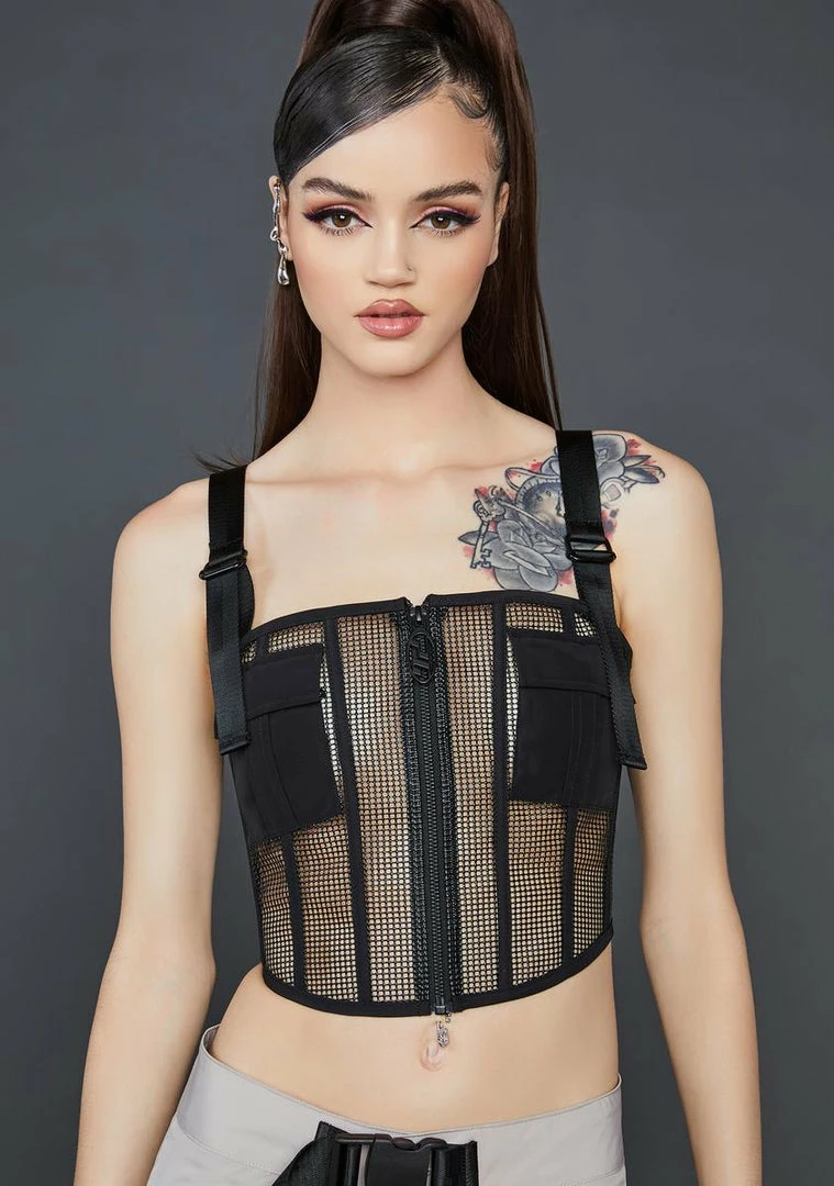 cuz the uprising has only begun. Outsmart them in this cropped corset that features shoulder straps with sliding buckles, a sheer vinyl-style netted fabrication, structured boning, flap pockets at front, and a front zipper closure with a branded pull.