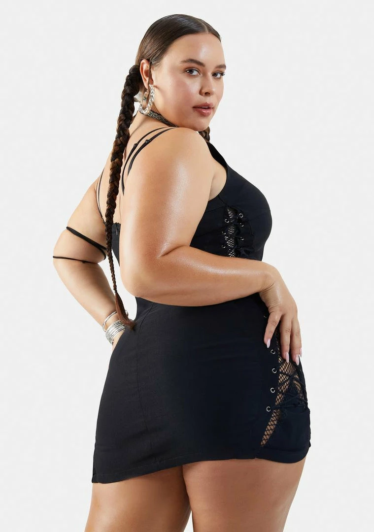 cuz youâre ready for hot girl summer! This tank mini dress has a low scoop neckline, adjustable shoulder straps, a stretchy bodycon fit, a back zip closure, and lace-up details with fishnet panels.