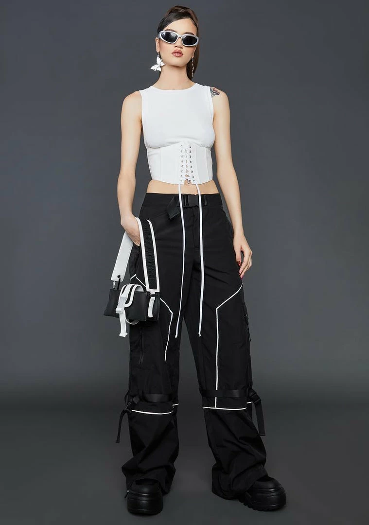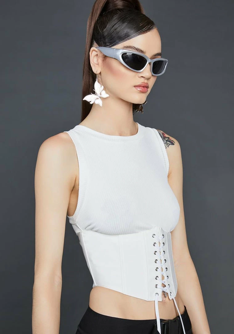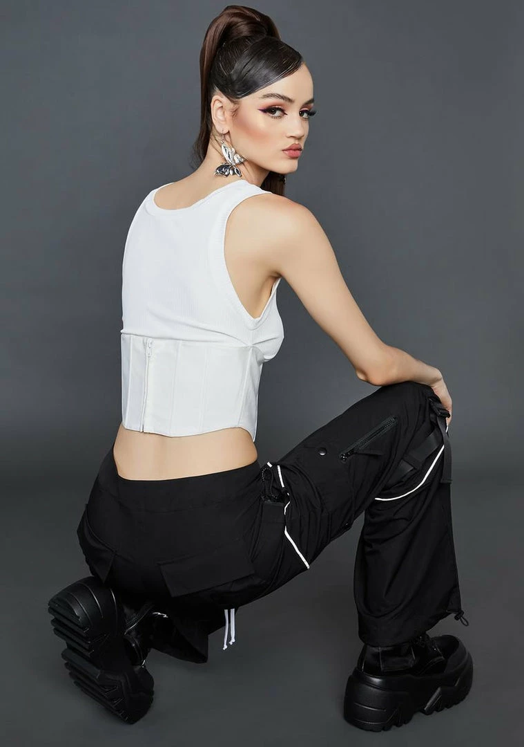 cuz you’re on a mission. Carry on in this cropped tank top that has a lace-up corset-style waistband, a stretchy ribbed fabrication, and a zipper closure at back.