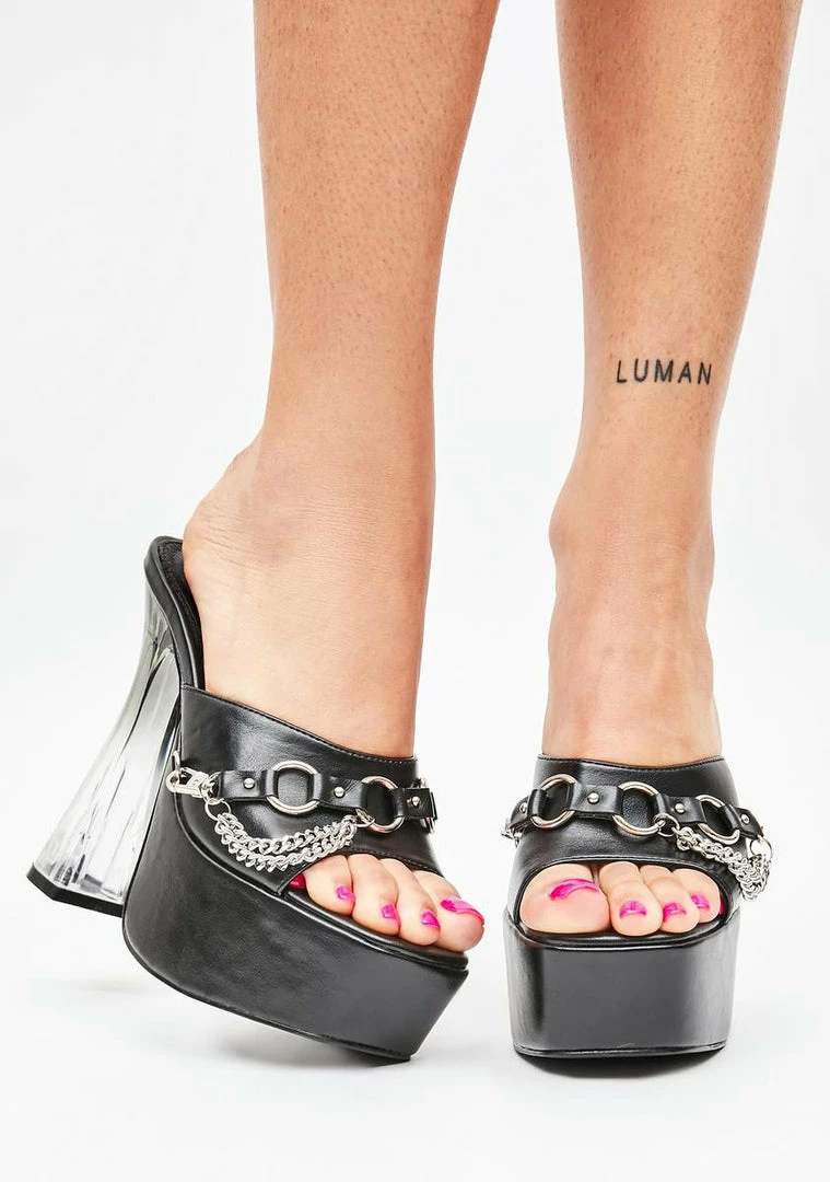 cuz weâre going up all night! Come through in these platform mules that have vegan leather uppers, chain detailing along the toe straps, and clear lucite heels.