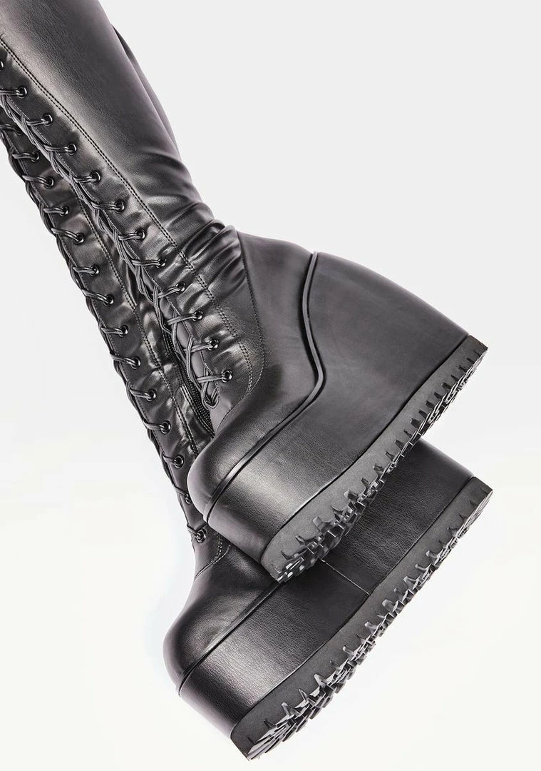 cuz they know youâre a baddie! These thigh high boots have a vegan leather construction, wedge platform soles, side zip closures, and adjustable lace-ups.