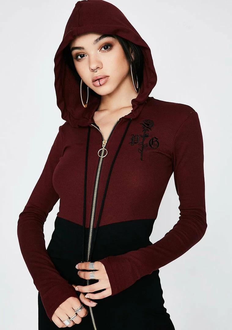 cuz youâre calling all the shots bb. This hooded jumpsuit has an embroidered logo on the front, flared bottoms and a zip closure.
