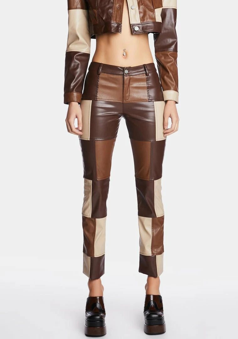 got them slidin’ in the DMs. These mid-rise pants have a soft vegan leather construction, color blocked patchwork panels, a front zip-and-button closure, straight cropped legs, and belt loops.