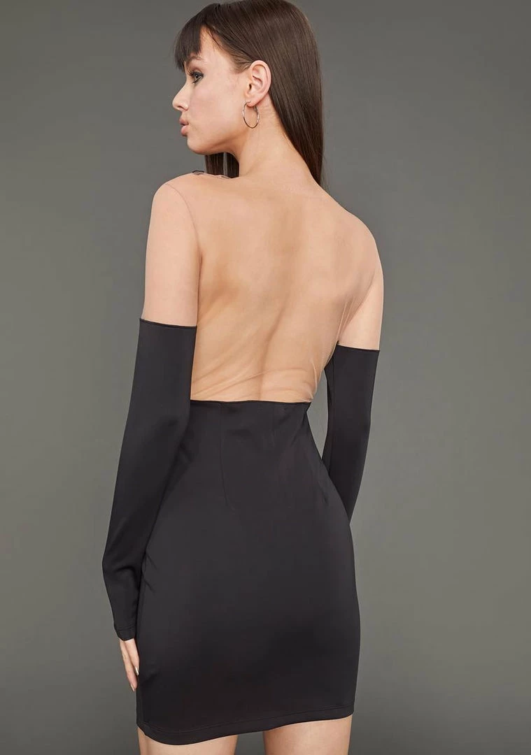 cuz they can look, but they canât touch. This mini dress has a nude illusion design with contrast mesh panels, long sleeves and a bodycon fit.