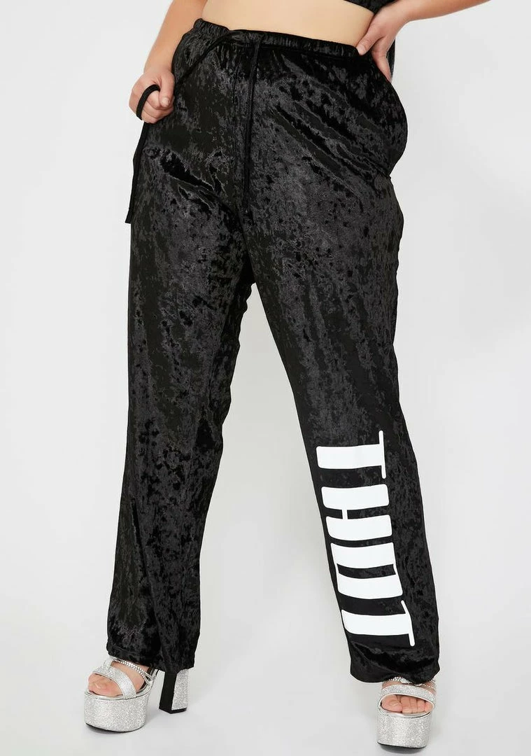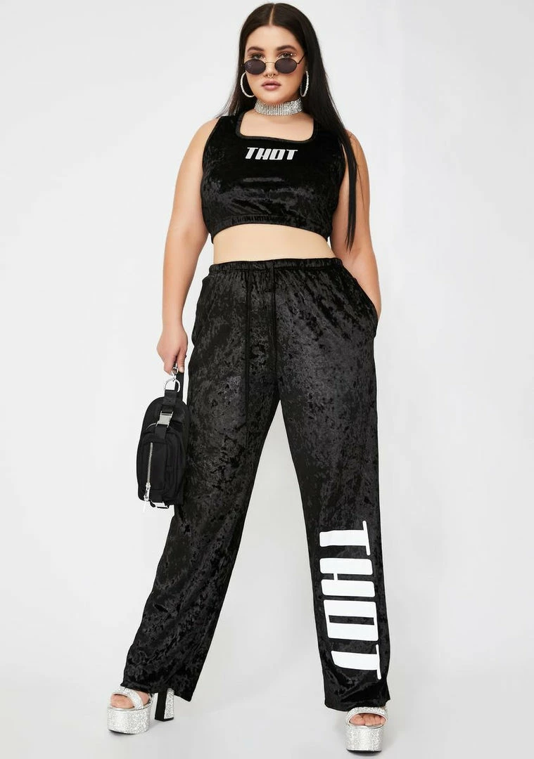 gotcha lookinâ like the clap back queen, sis! Youâre forever unbothered by the basics in these high waist sweatpants that has a supa soft velour material, drawstring waistband Nâ sikk reflective âTHOTâ graphic on the front.