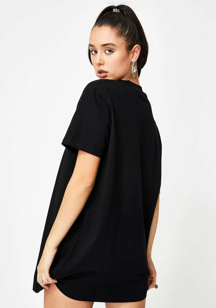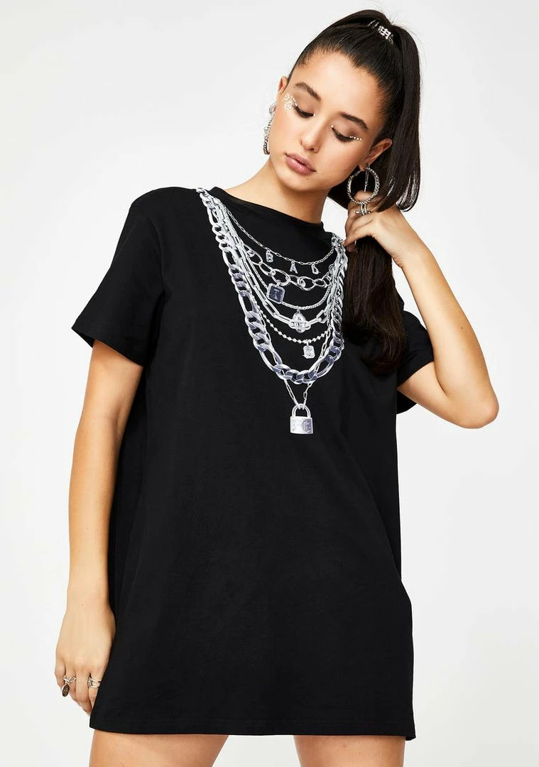 cuz ur leveling up the competition, bb! Let them know you always mean business while flexing in this crewneck t-shirt dress with a relaxed fit and chain necklace graphic design on the front.