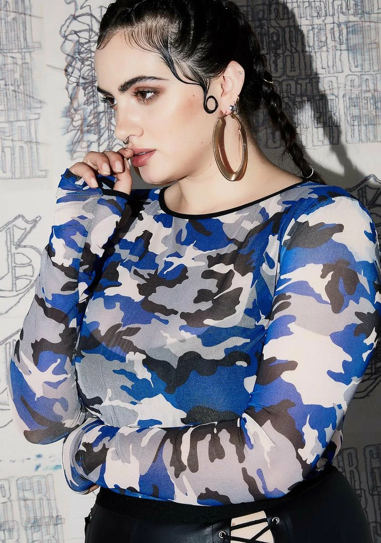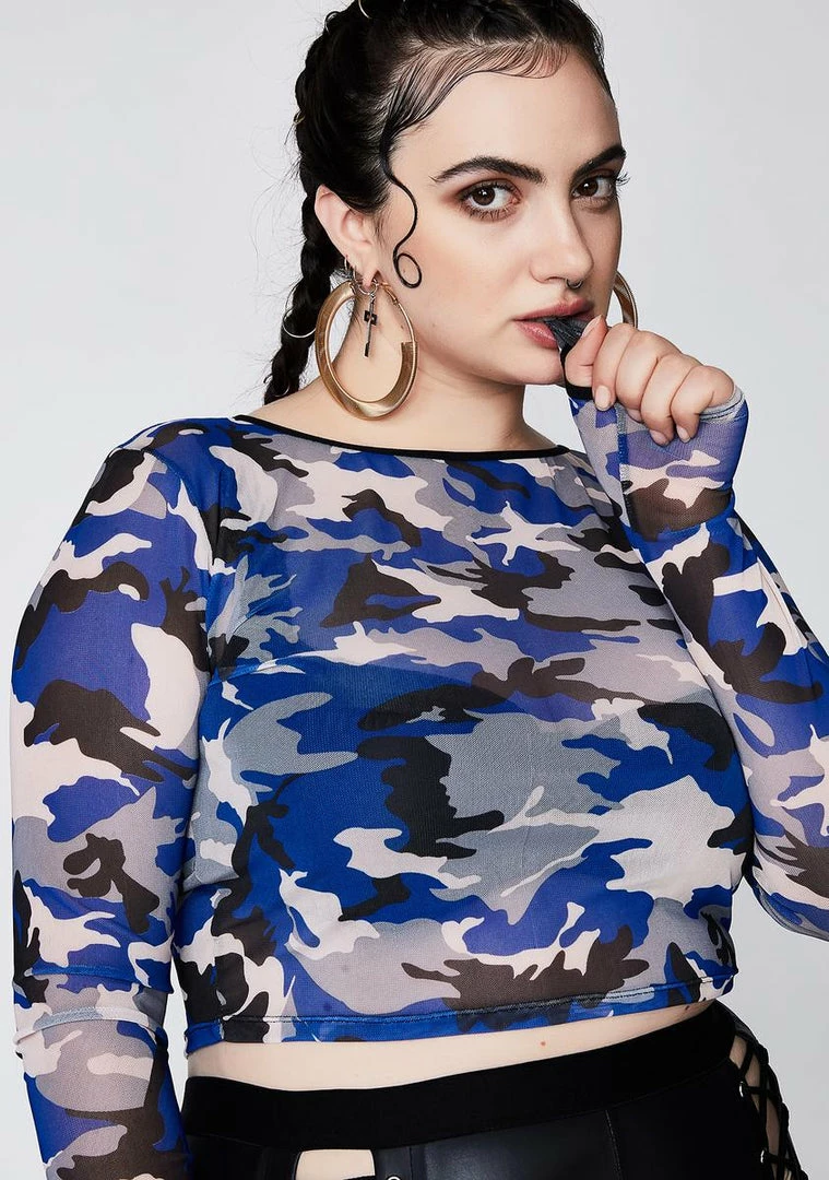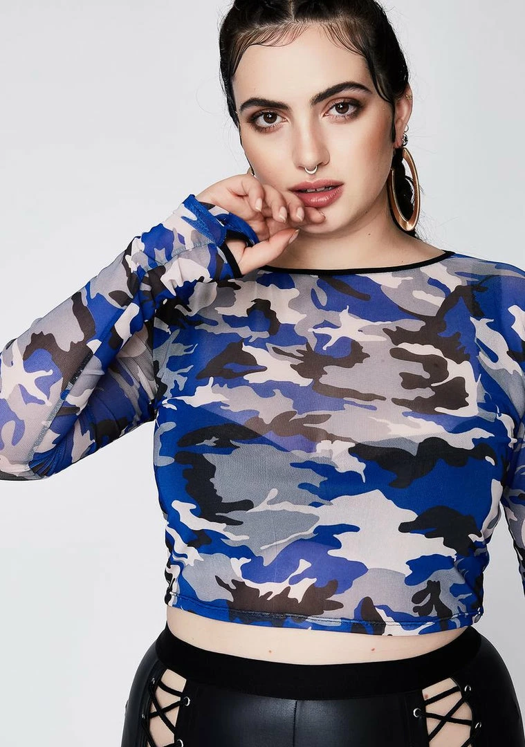 cuz nothinâ can intimidate ya. This sheer blue camo print top has long sleeves and a cropped length.