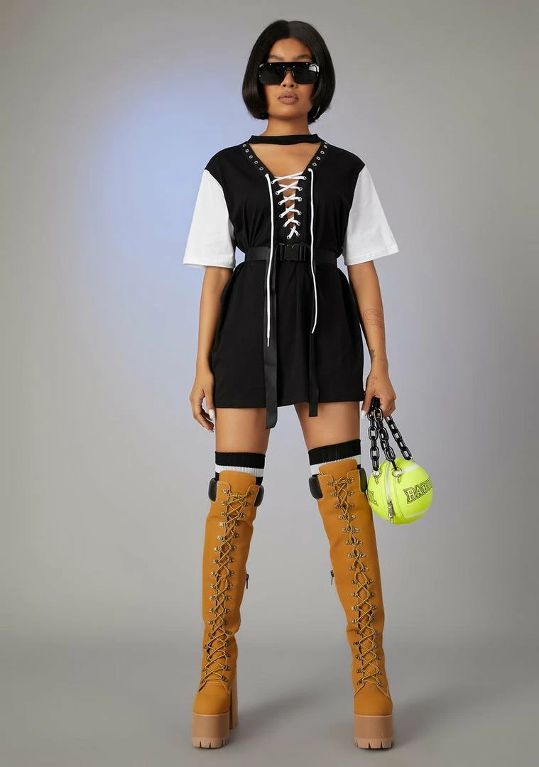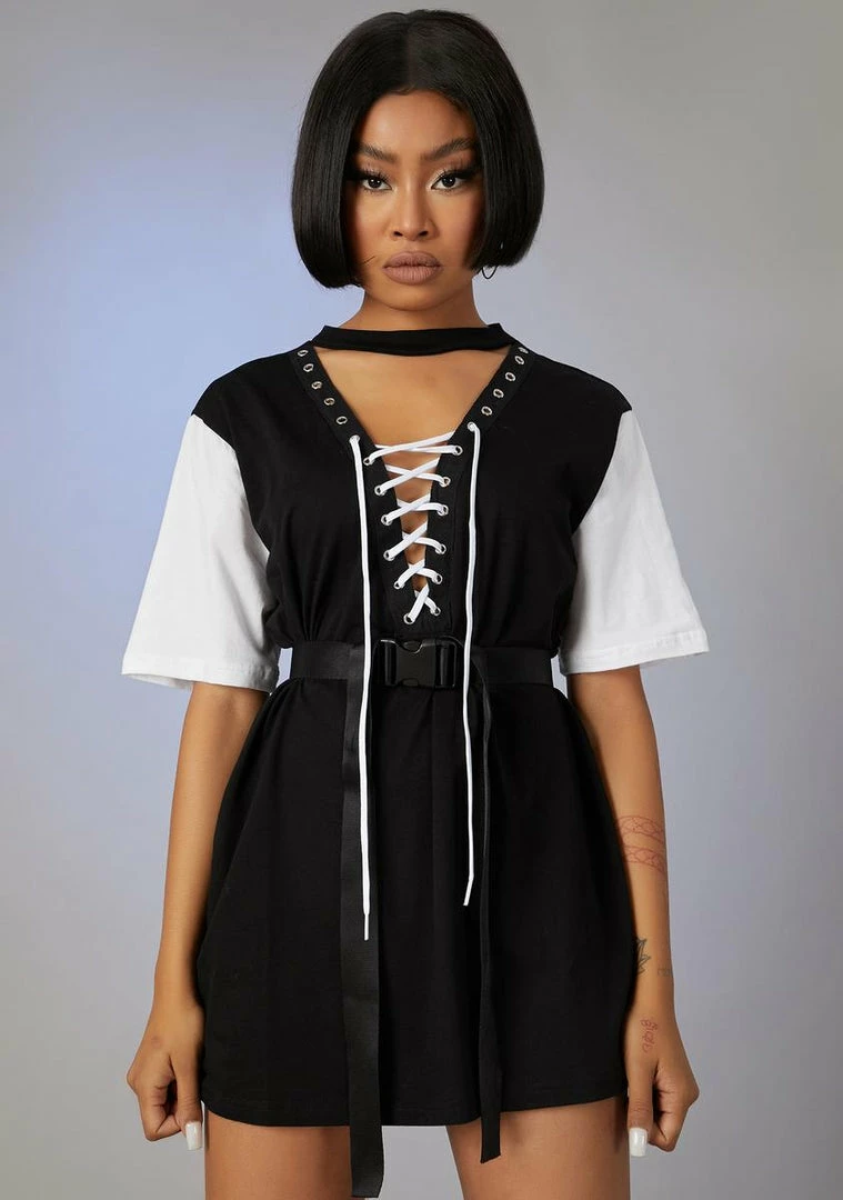 cuz you always keep it exciting. This t-shirt dress has a lace-up detailing and different color sleeves with a buckle belt.