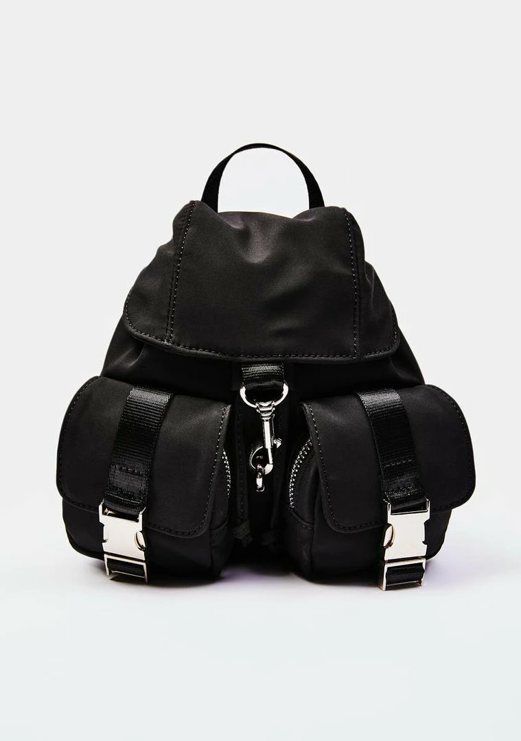 you’re keeping a low profile. This mini backpack has a main compartment with a fold over top and clasp closure, two small exterior pockets with zipper and silver buckle closures, and adjustable shoulder straps.