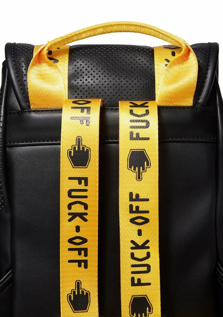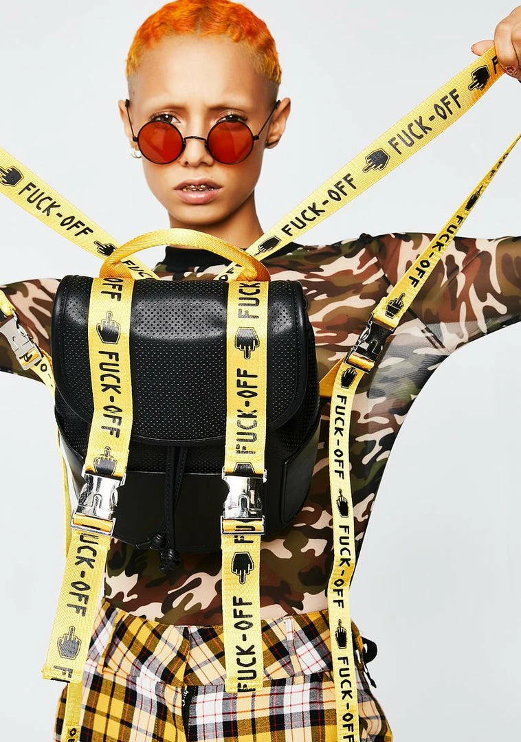 when you wanna say it loud Nâ clear. This black vegan leather mini backpack has a drawstring closure and yellow straps with silver buckle details that say âFUCK-OFFâ.