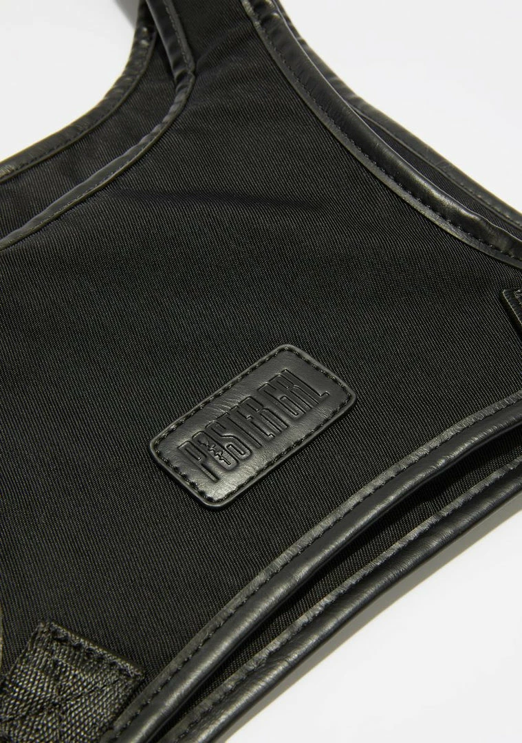 cuz you donât work for the money, the money works for you! This boss utility fanny pack has a quilted construction with vegan leather trim, adjustable body harness straps, and a front zip closure.
