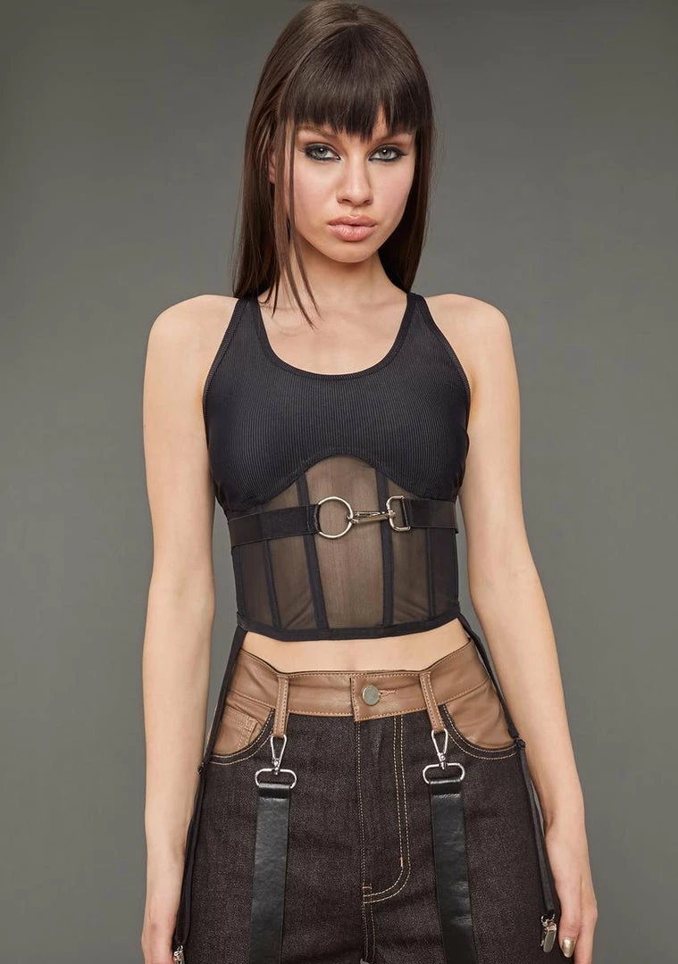 cuz you’re always commanding attention. This mesh corset tank top has a cropped fit, underwire support, O-ring and clip hardware details on the front, and long garter straps on the sides.
