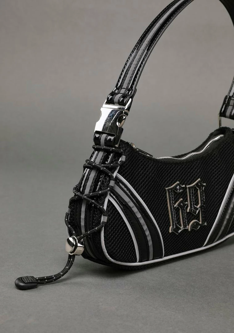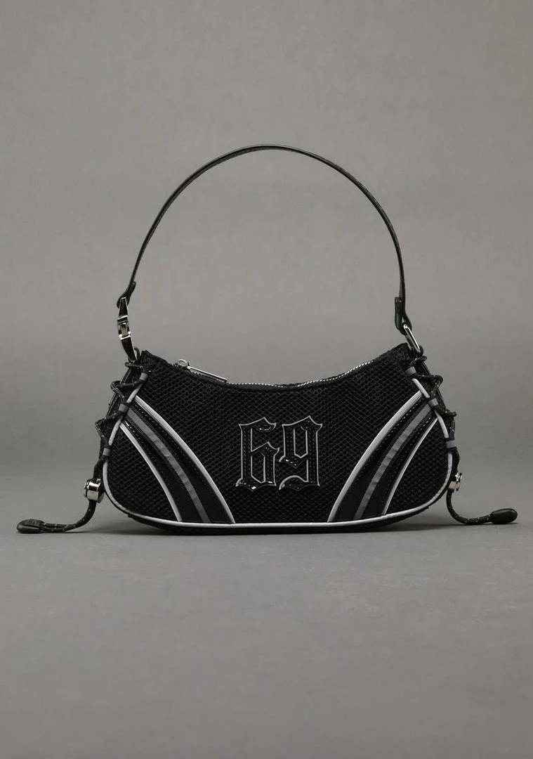 if we told you, we’d have to kill you. Get the team together with this mini shoulder bag that features a mesh and vegan leather fabrication, “69” appliques at front, lace-up drawstrings at sides, a top zip closure, and an interior zipped pocket.