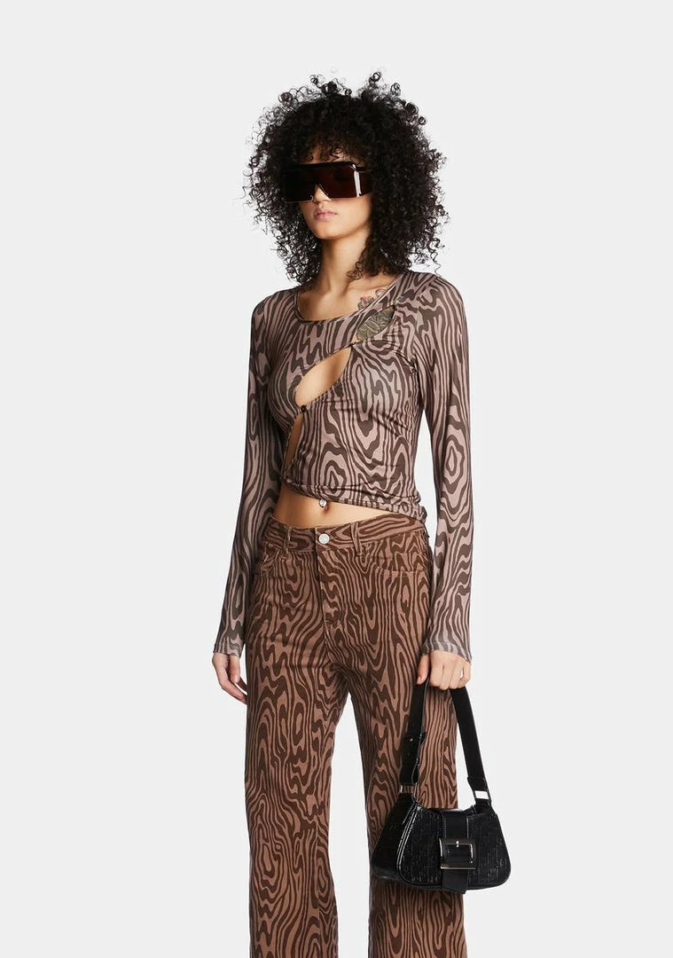 cuz reality is merely an illusion. This top has a stretchy construction, an all over psychedelic swirl wood grain print, an asymmetrical cut out design, button closures, long sleeves, and a cropped fit.
