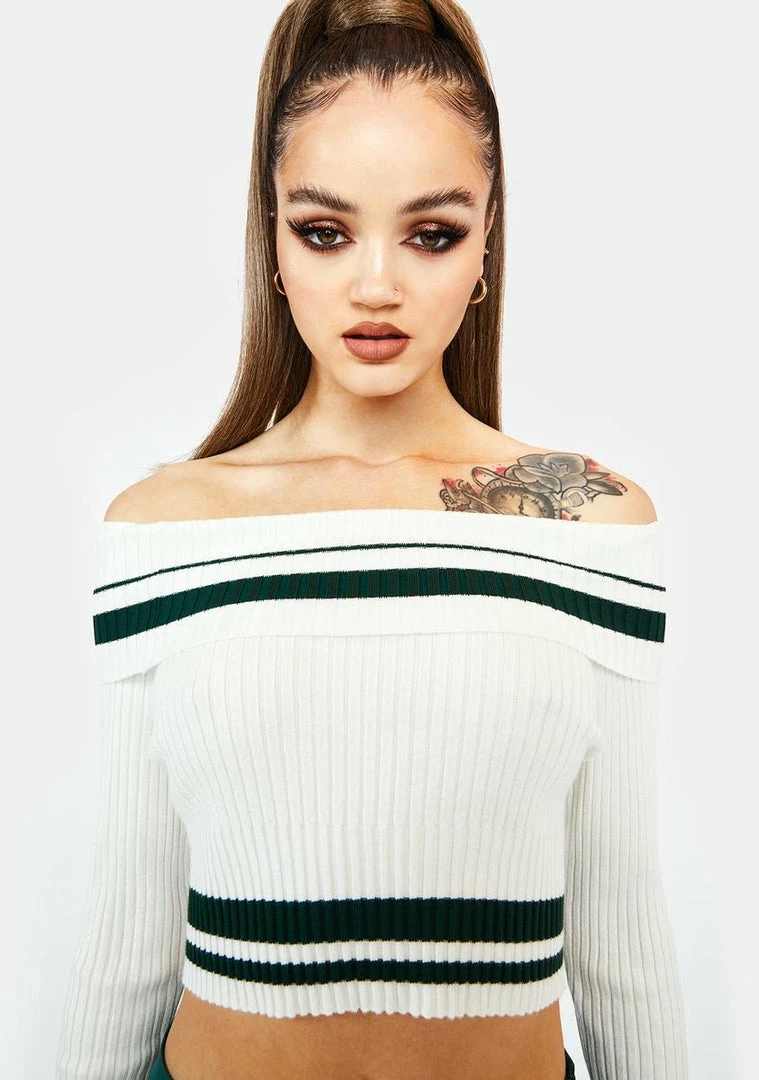 cuz are you the sinner or are you the saint? This ribbed knit off shoulder sweater has long sleeves, a cropped fit, and stripe details.