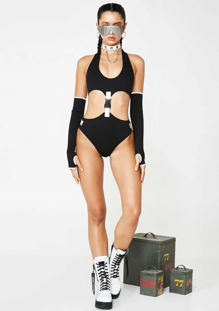 cuz your style is too unique, bb! Youâre levelz above âem in this sexxxy cut-out bodysuit that has a front buckle closure, reflective trim, and comes with matching gloves that have thumbhole cuffs.