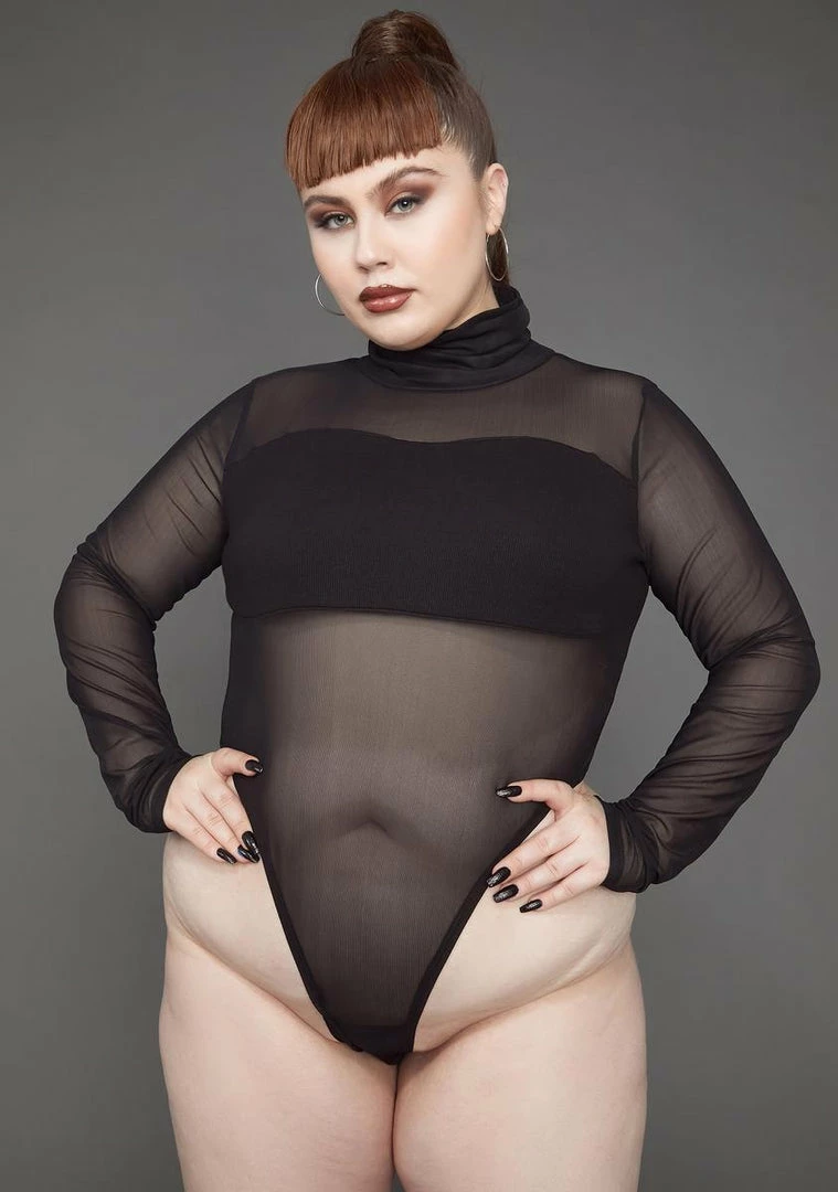 cuz they wanna know your secrets. This mesh turtleneck bodysuit has long sleeves, a high leg cut, a solid panel across the bust, and bikini snap closures.