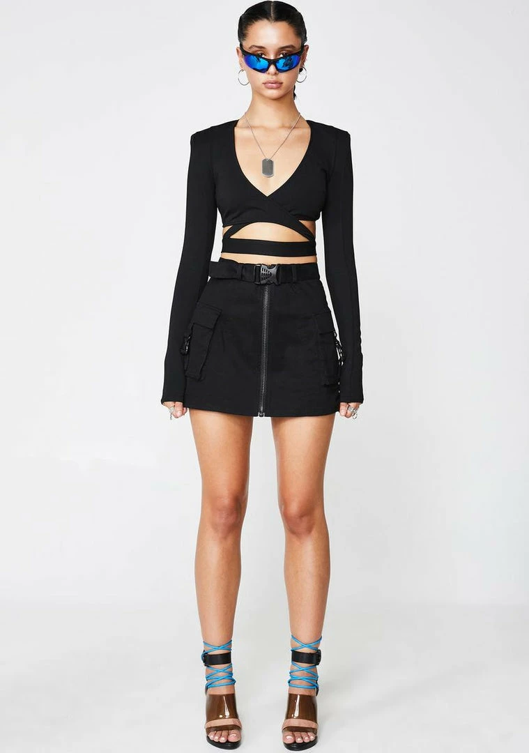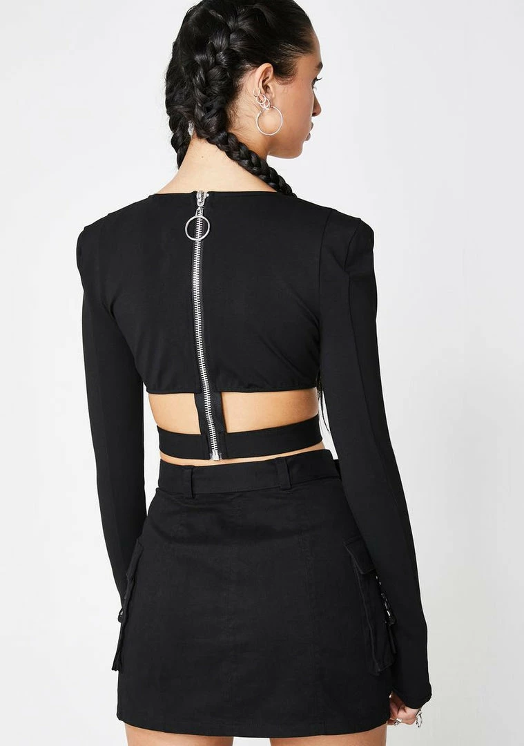 cuz ya in a bo$$ bish mood! Tell âem to cut ya check in this long sleeve crop top that has a plunging V- neckline, certified cut outs, power status shoulders Nâ a back zip closure.