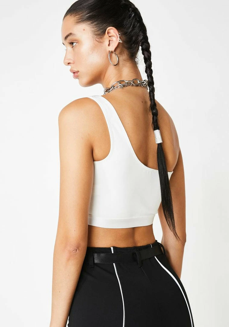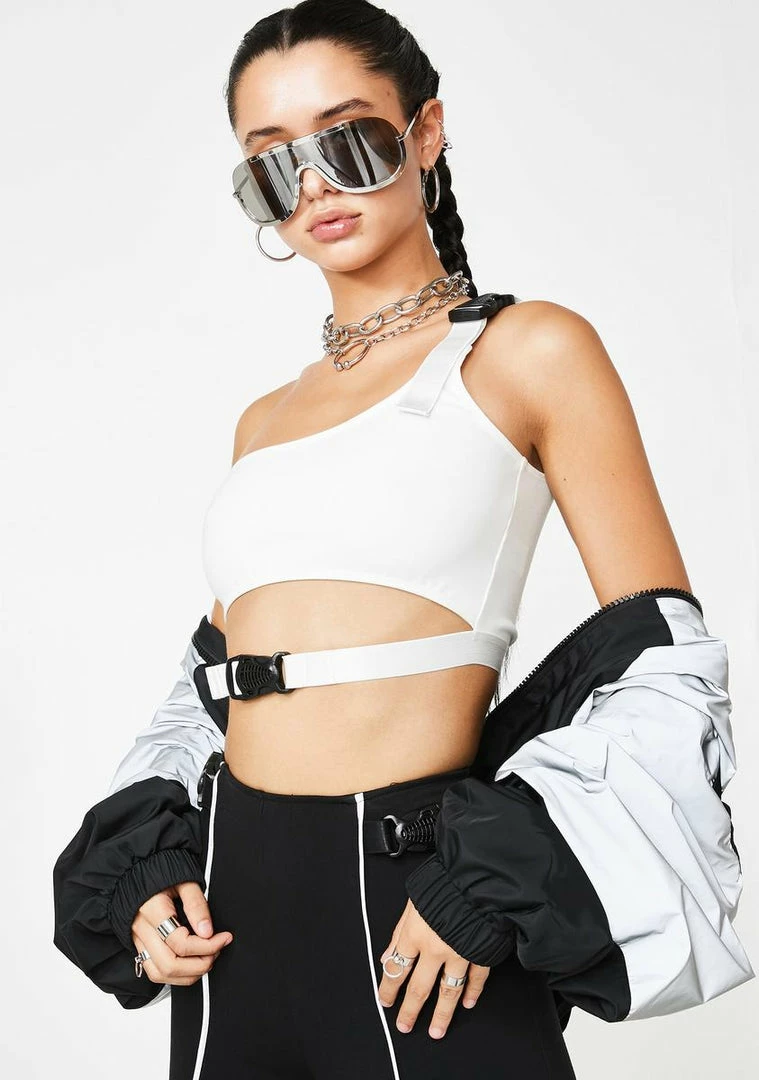 they know youâre poppinâ, babe. Tell âem to wait their turn in this fit so fire asymmetrical tank crop top that has a one shoulder design, adjustable buckle straps, front cut out Nâ supa slim fit.