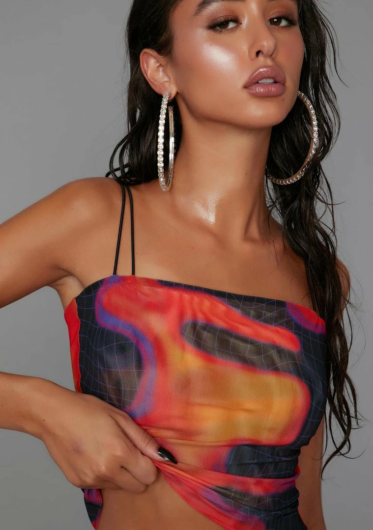 caution: too hot to handle. This smoldering crop tank has a low square neckline, dual cami straps, and a mesh construction with a heatmap print all over.