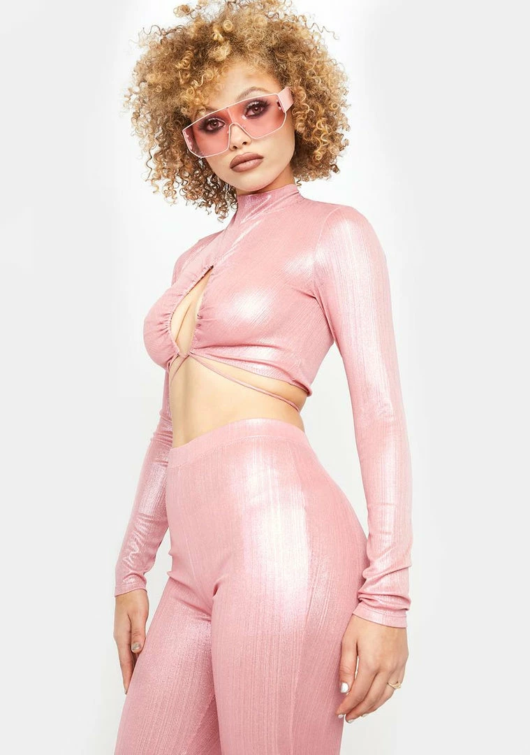cuz you’re a snow bunny on skis. This shimmer metallic long sleeve top has a mock neckline, a keyhole cut out wrap top design, and has a cropped fit.