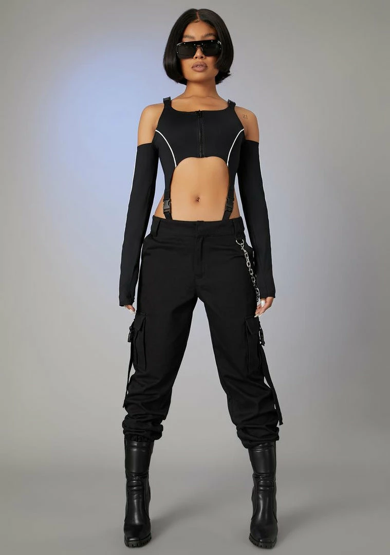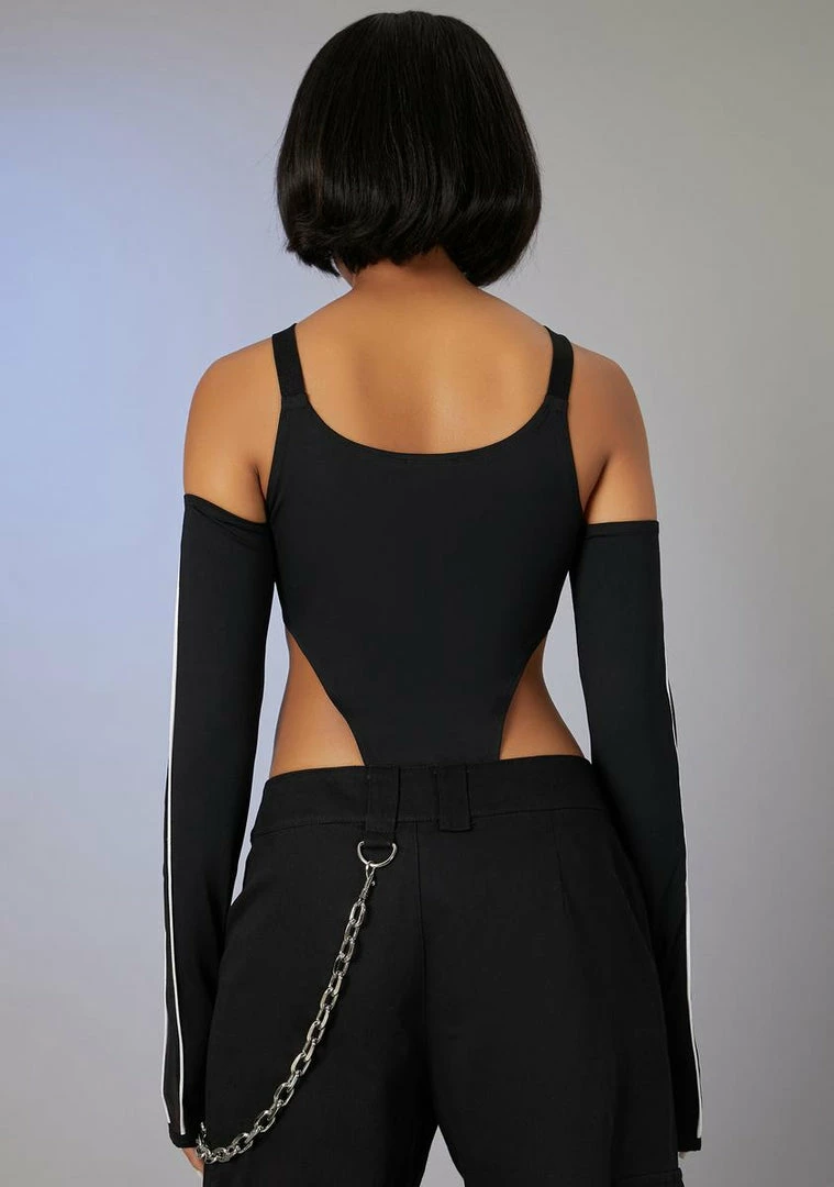 cuz you live life in the fast lane. Take flight in this long sleeve bodysuit that has reflective piping, a front zip closure, buckle hardware, cold shoulder cut-outs and a thong back.