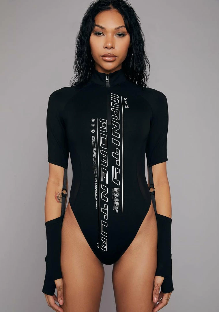 because there’s always room for one more. Go forever in this mock neck bodysuit with a front zipper, cutout strappy sleeves with thumb holes, mesh side panels, and “infinity momentum” printed on the front.