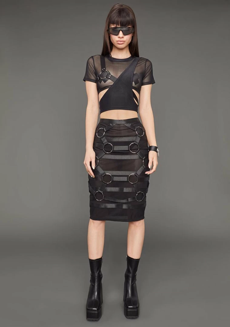 watch my stories and like my posts! This short sleeve mesh crop top has an asymmetrical O-ring body harness attached.