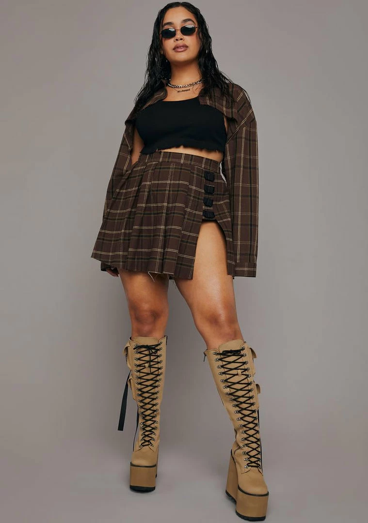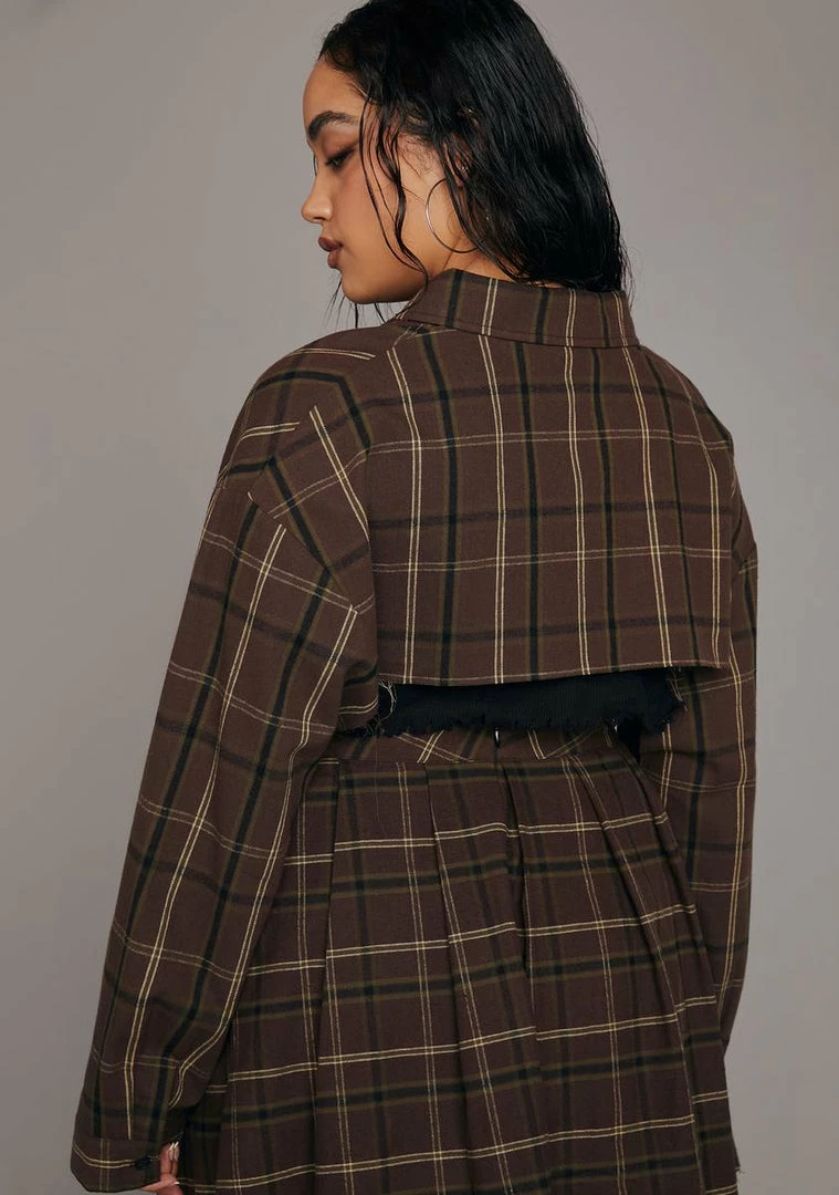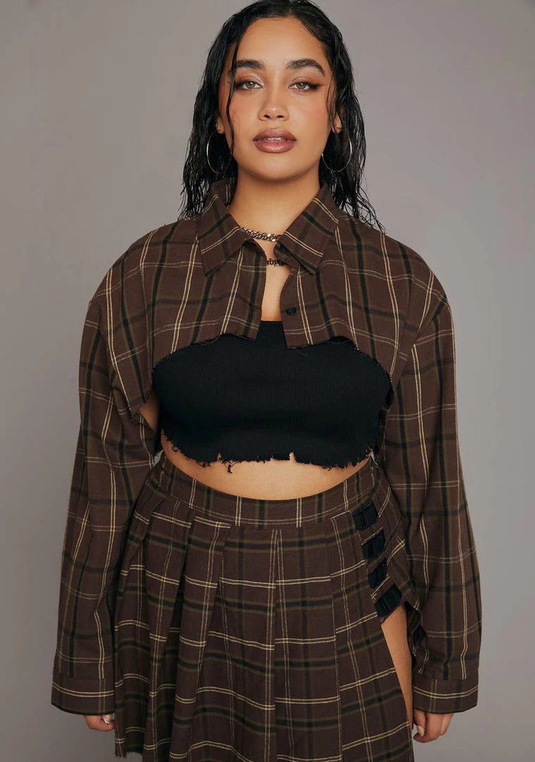 she can be the strong silent type. Play it up in this super cropped shirt with a collar, long sleeves, buttons up the front, and a plaid pattern.